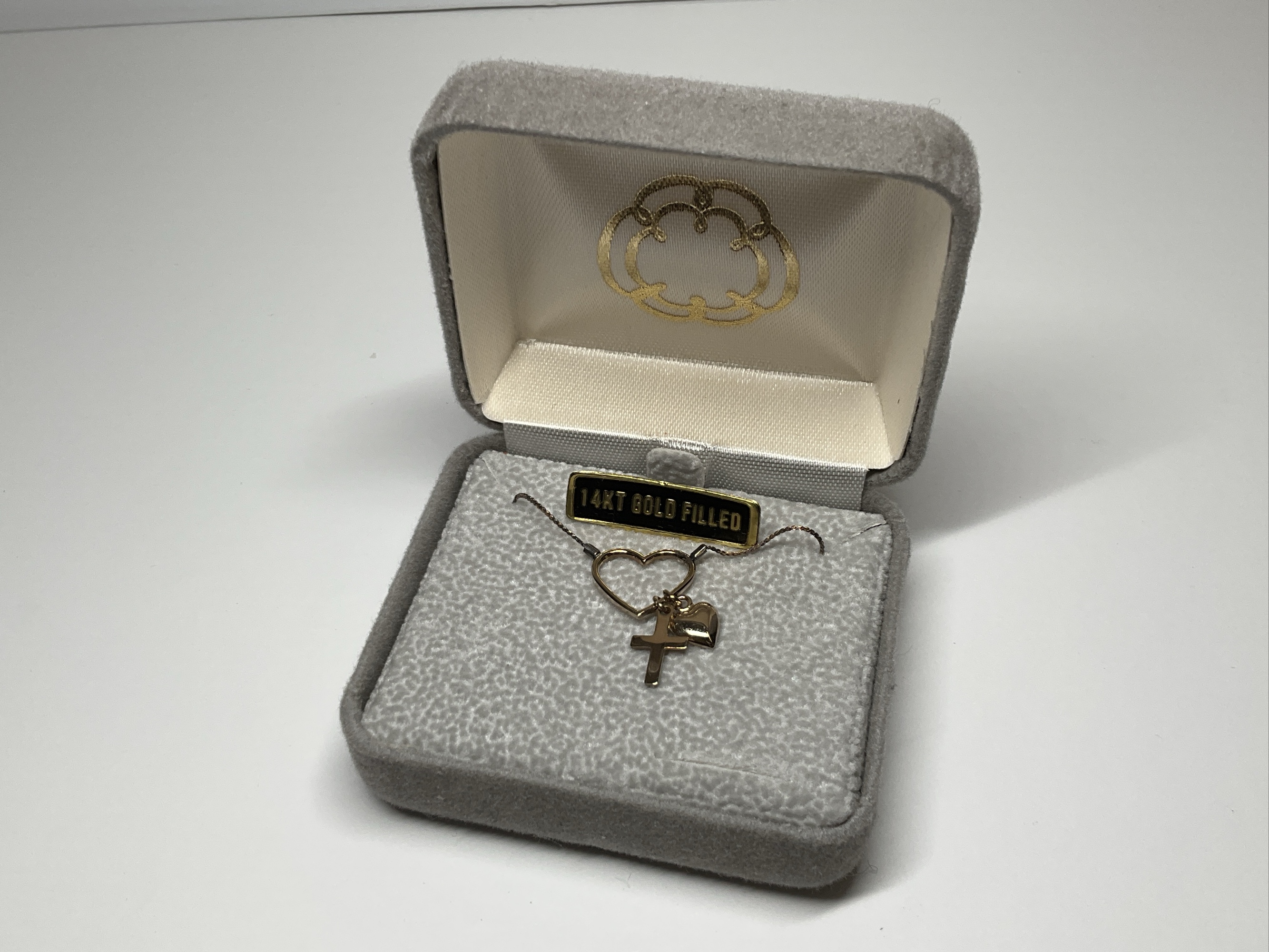 This listing features a 14K gold filled necklace. The pendant includes a heart and cross design. Comes with display box.