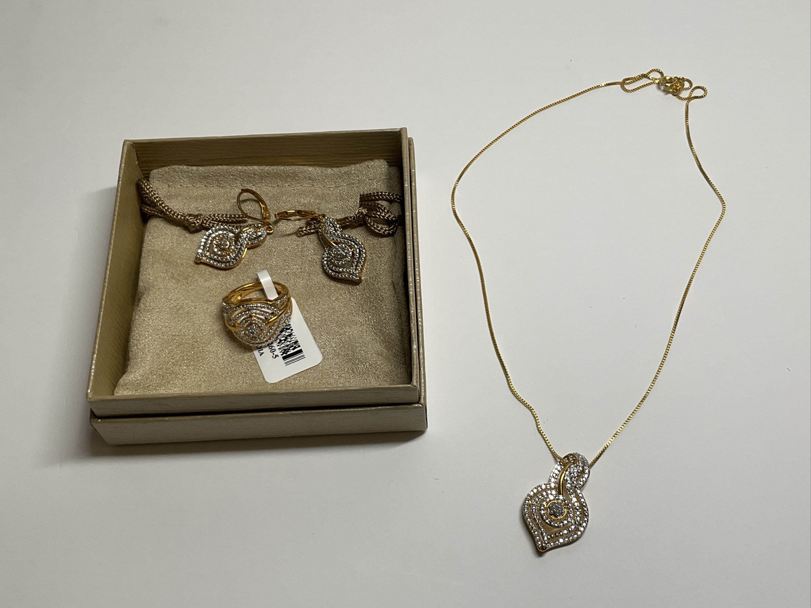 JTV Emulous .25CTW Diamond set, featuring a 14K yellow gold over brass size 5 ring, matching earrings, and a pendant with an 18 in. box chain.