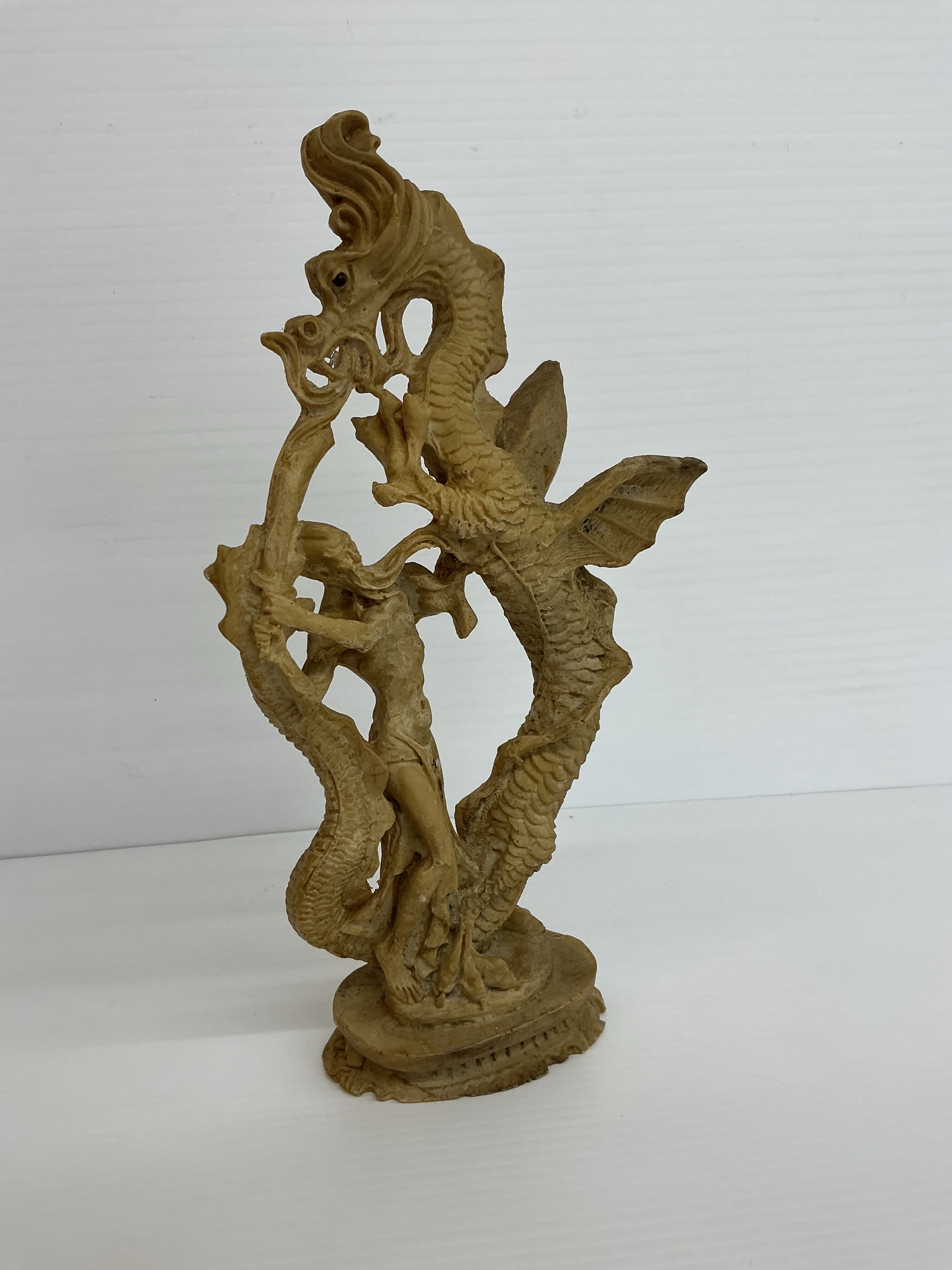 Detailed resin sculpture featuring an asian man intertwined with a dragon. The piece has intricate details and is mounted on a base. 14 in. tall