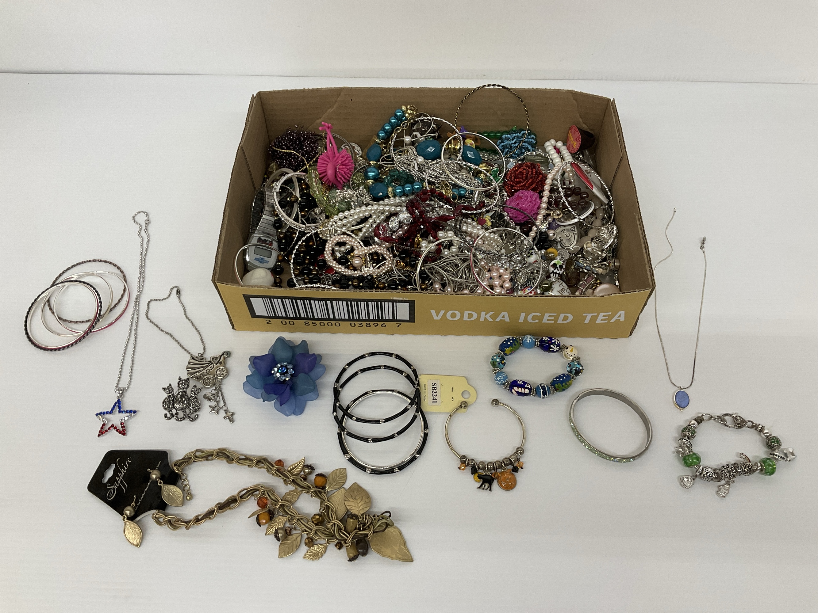 This lot includes a variety of jewelry pieces, including necklaces, bracelets, earrings, and pins. Styles range from beaded to metal, with decorative elements.