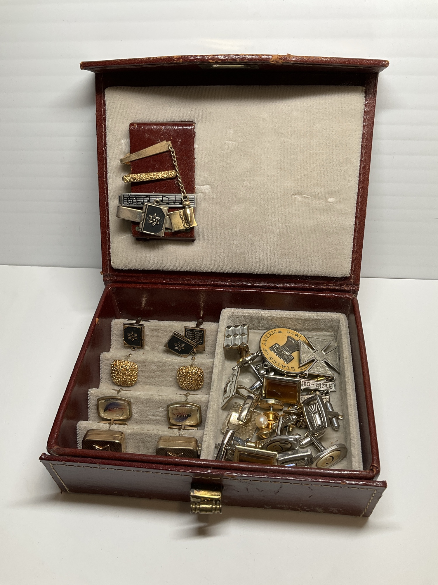 A collection of cufflinks and tie clips, some in matched sets, presented in a jewelry box. Various styles and materials.