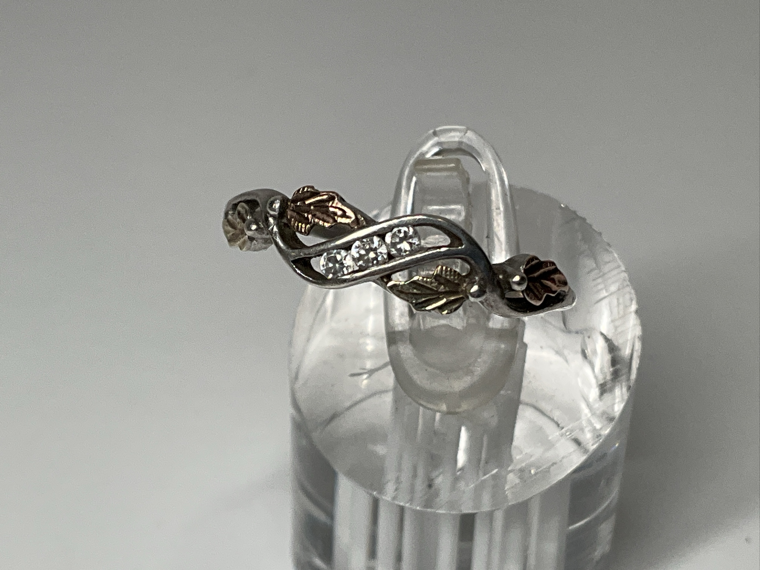 This is a beautiful sterling silver size 10 ring featuring 10K Black Hills gold accents in a unique leaf design. The ring also features three sparkling stones.