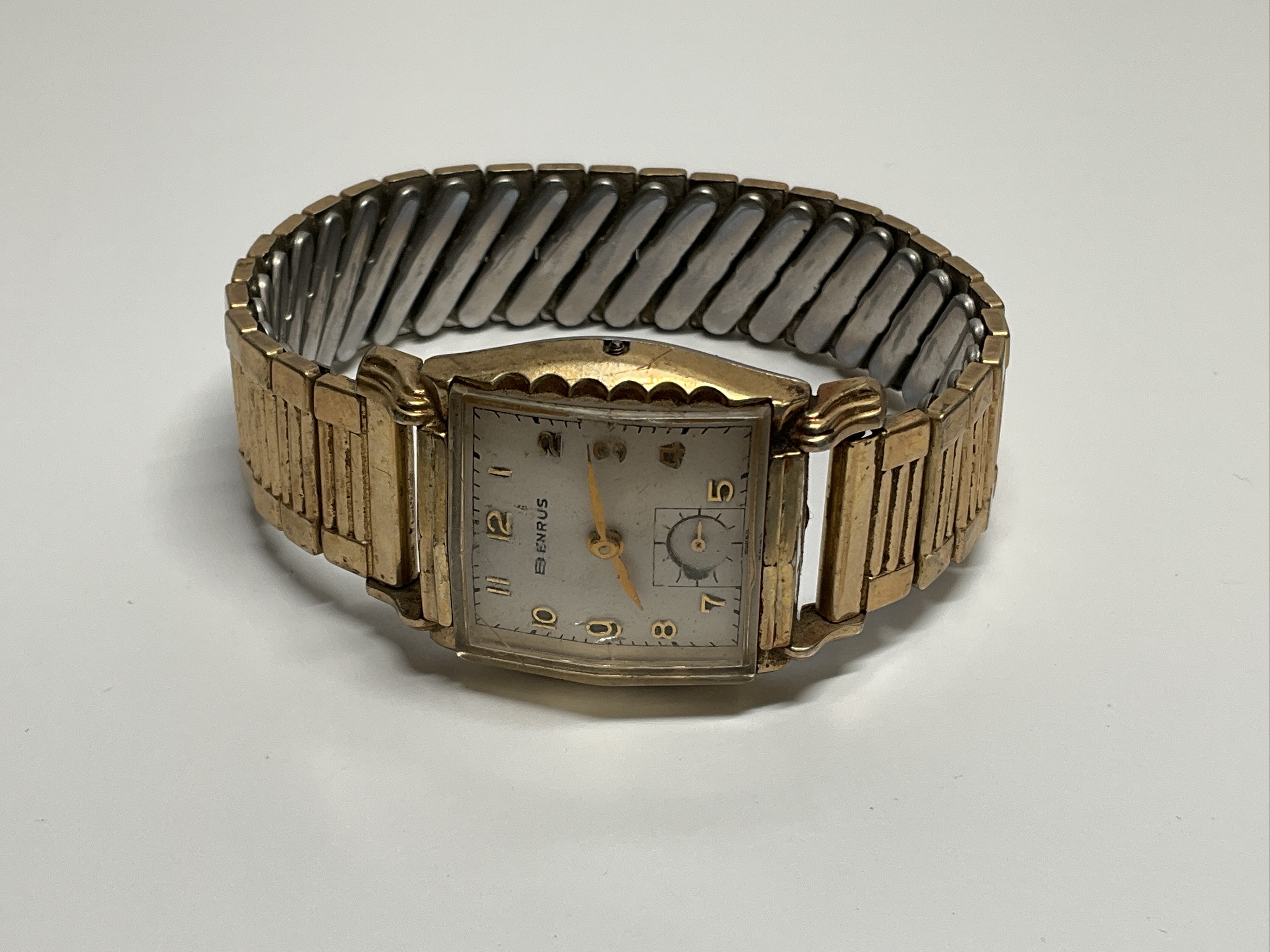 This is a Benrus watch with a gold-filled case and stainless steel back. The watch has a square face with numerals at the quarter-hour marks and a second hand dial. We do not guarantee watches to run.