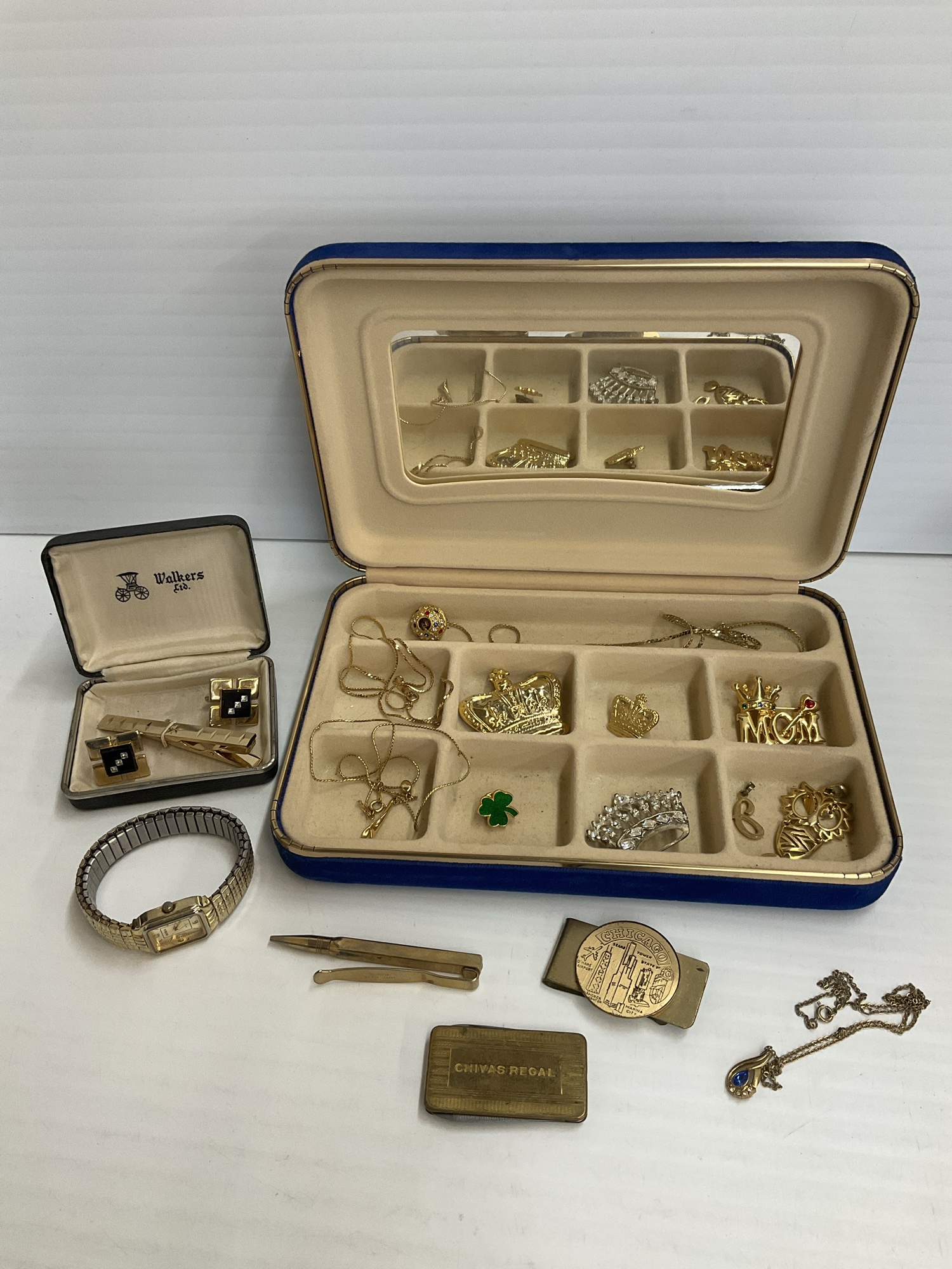 Includes a collection of costume jewelry, a Benrus watch, cufflinks, and other collectible items. We do not guarantee watches to run.