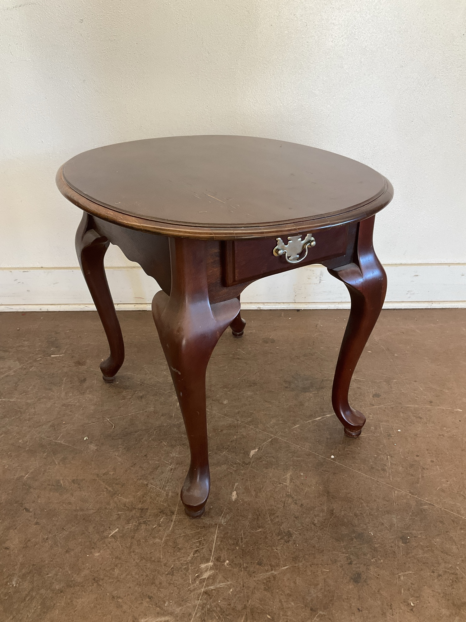 Small dark wood side table with a rounded top and distinctive legs. Features a small drawer with decorative handle. Has minor scratches and foot damage. 22 x 22 x 27 in.