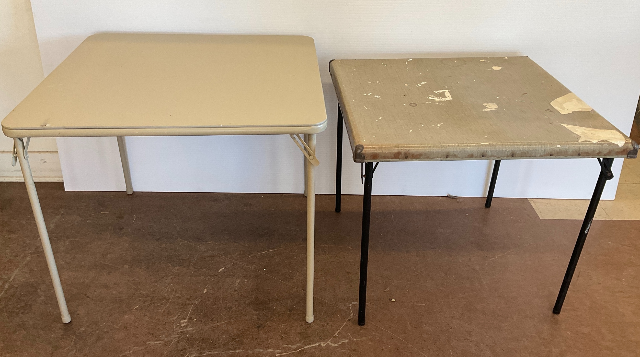 You are bidding on two folding card tables. One is a Cosco table manufactured in 2007. The other is a Samsonite table. One top has damage. 28 x 34 x 34 in. and 26 x 30 x 30 in.