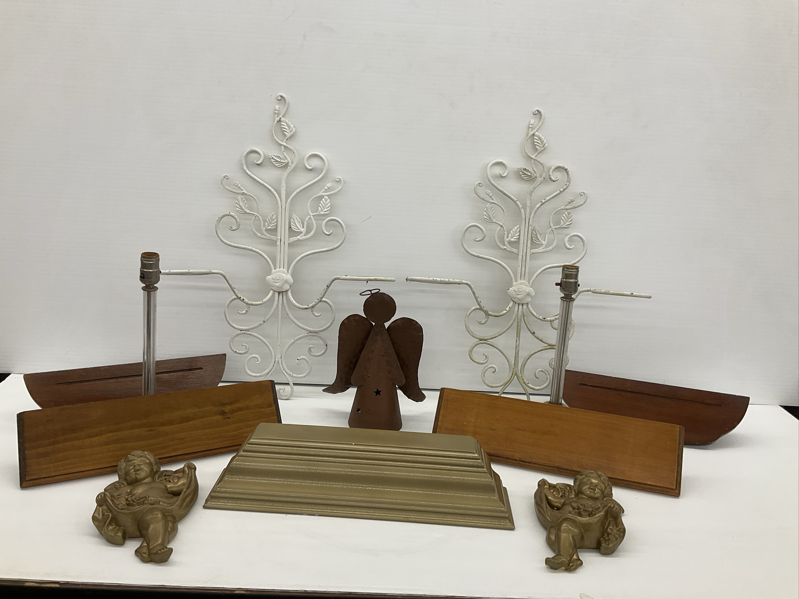 Mixed lot includes metal flower pot holders, angel decor, cherub figurines, wood wall shelves and composite display elements, and pair of glass table lamps. Largest 27 x 19 in.