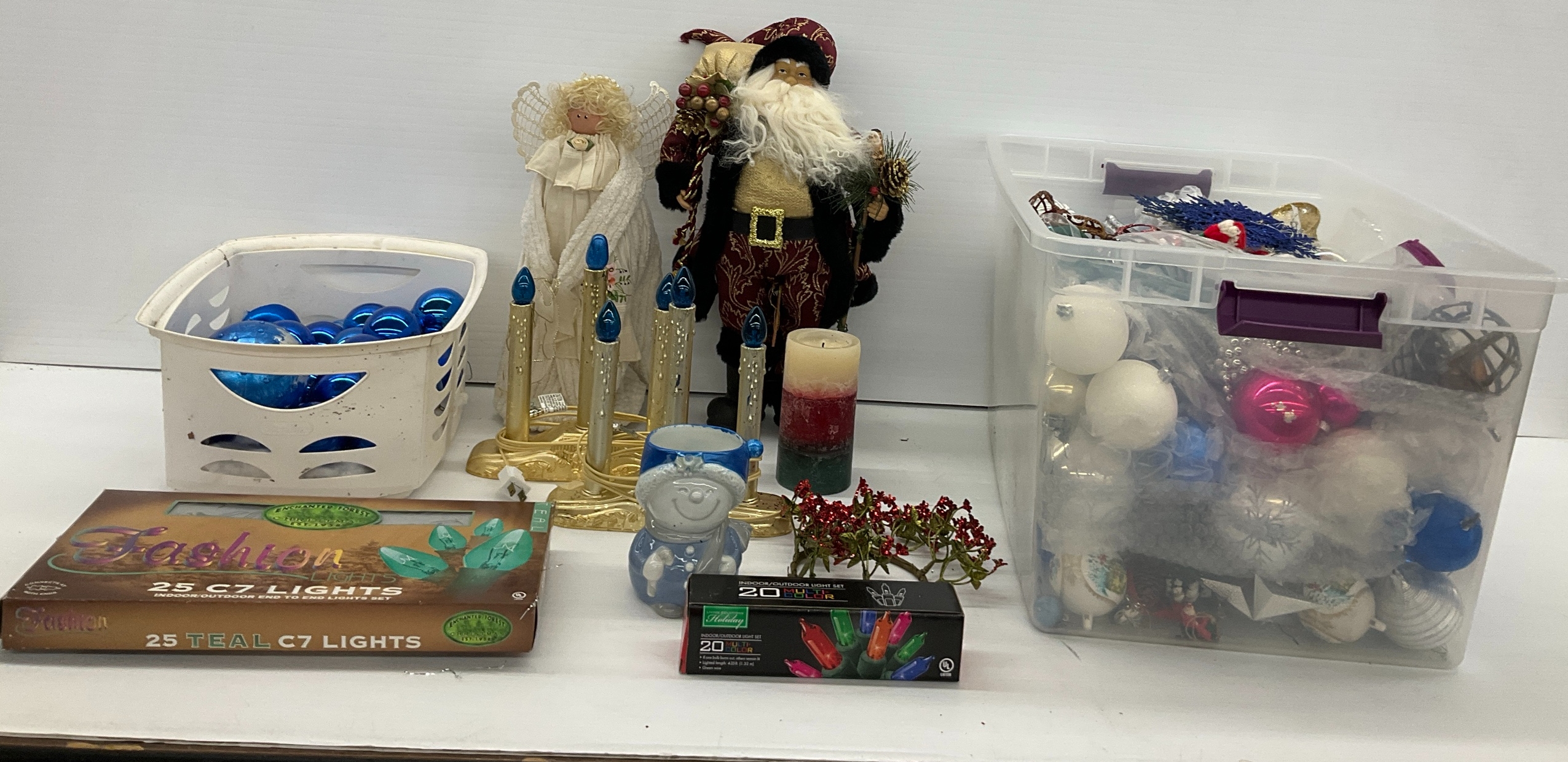Collection of holiday decorations, including a Santa figurine (17 in. tall), angel figurine, candle holder, ornaments, and light sets.