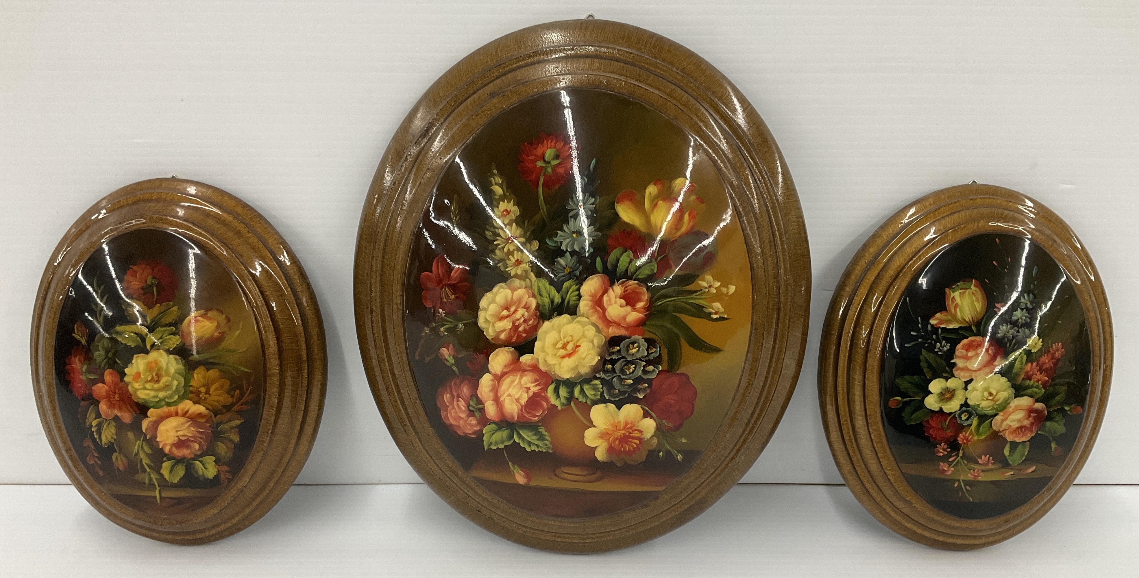 This set features three decorative wall art pieces. Each plaque is oval-shaped with a wooden frame and features a vibrant, colorful floral arrangement displayed in a vase. Largest 13 x 11 in.