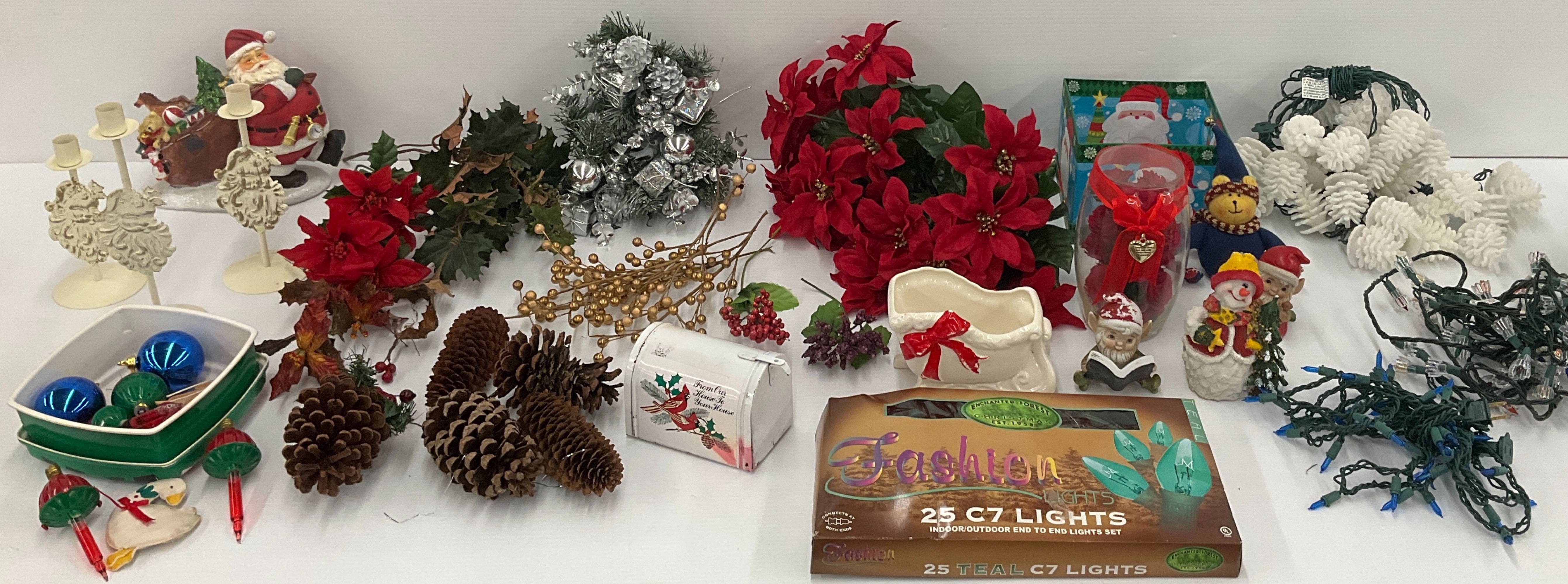 Collection of Christmas holiday decorations, including ornaments, figurines, candle holders, floral decorations, lights, and more.