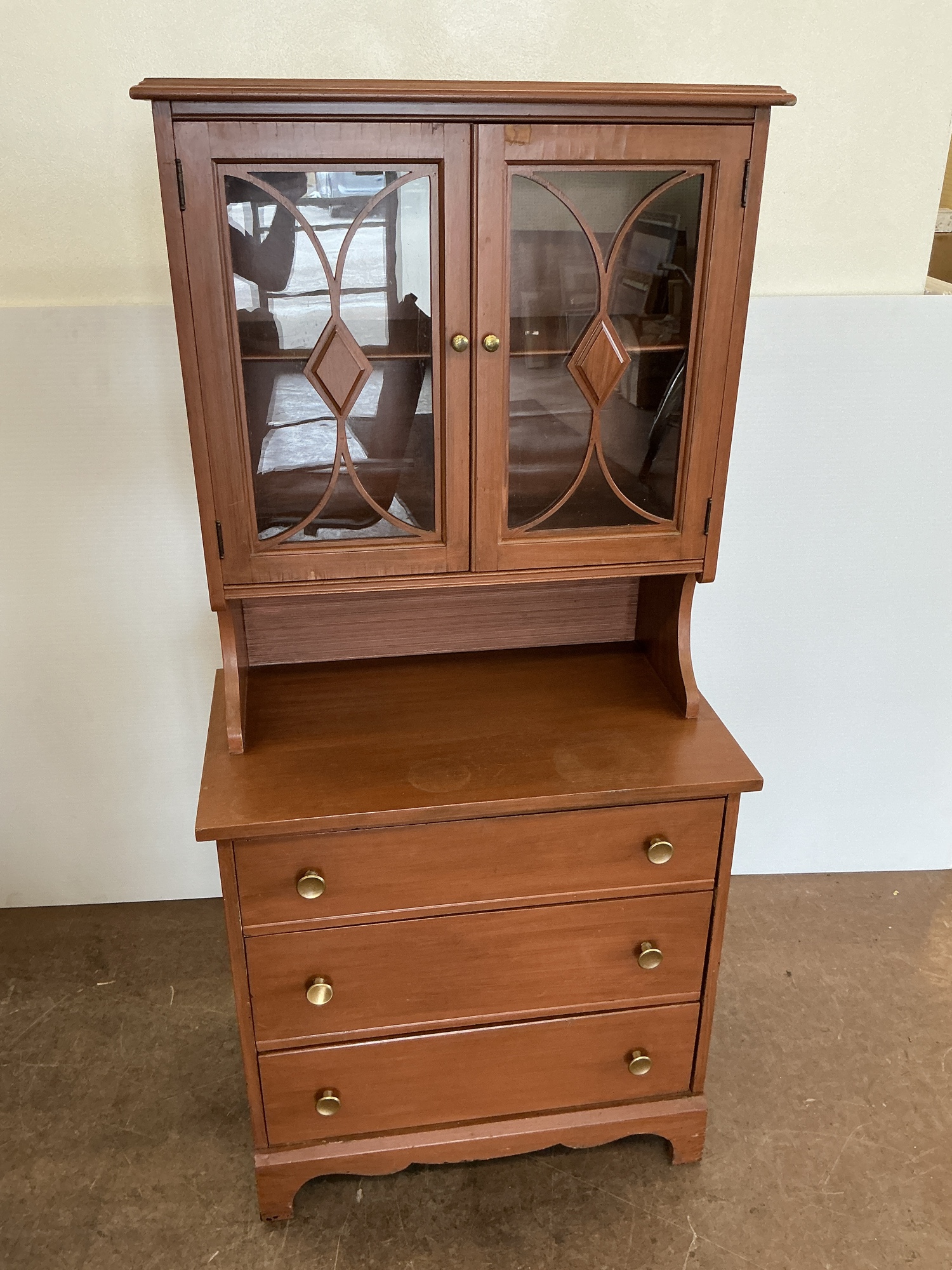 Freestanding wooden cabinet featuring glass doors with diamond pattern, shelving in upper section, and three drawers in lower section. 61 x 29 x 17 in.