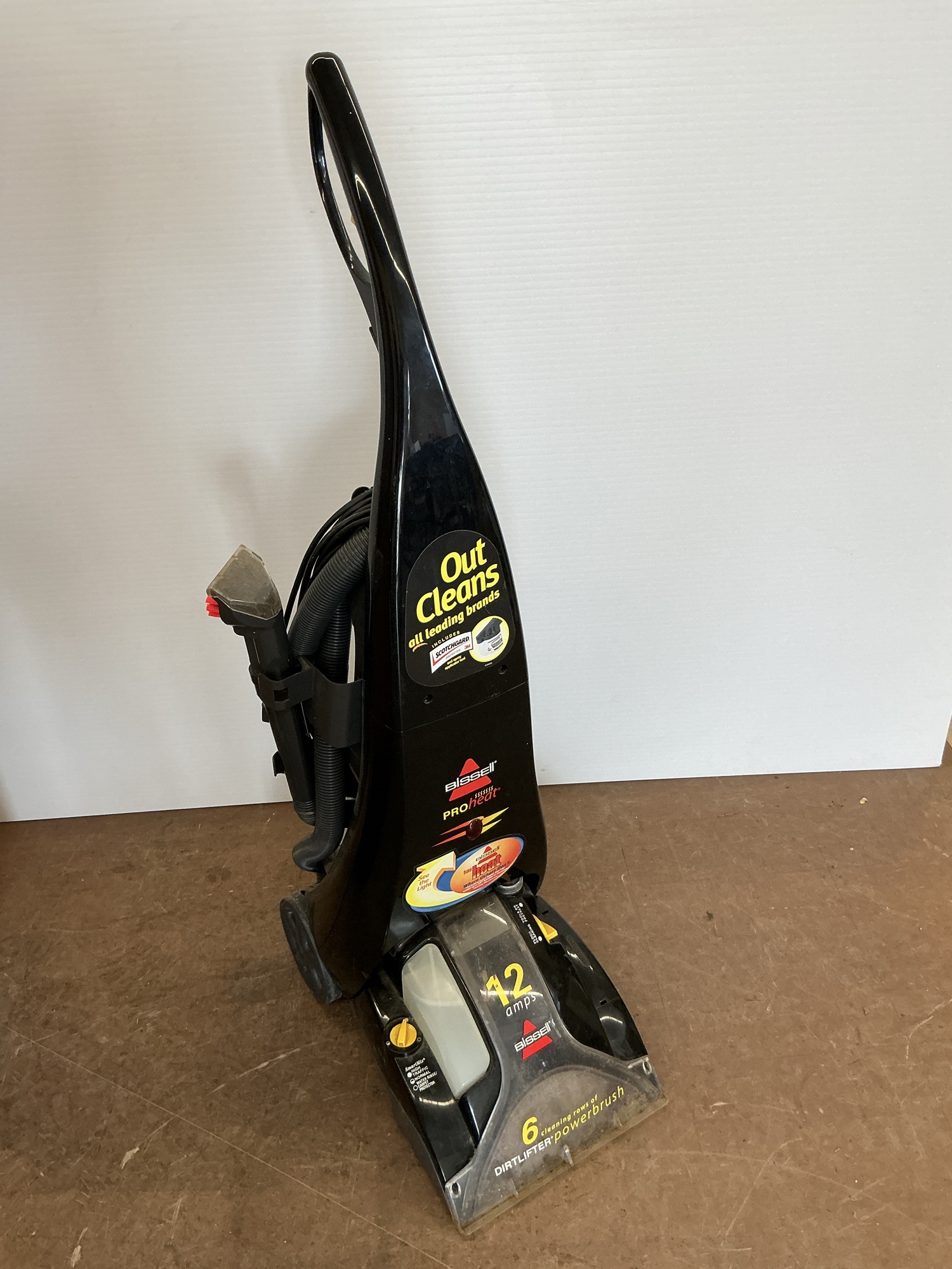Bissell ProHeat 2X carpet cleaner featuring a 12 amp motor and DirtLifter PowerBrush. Includes attachments.
