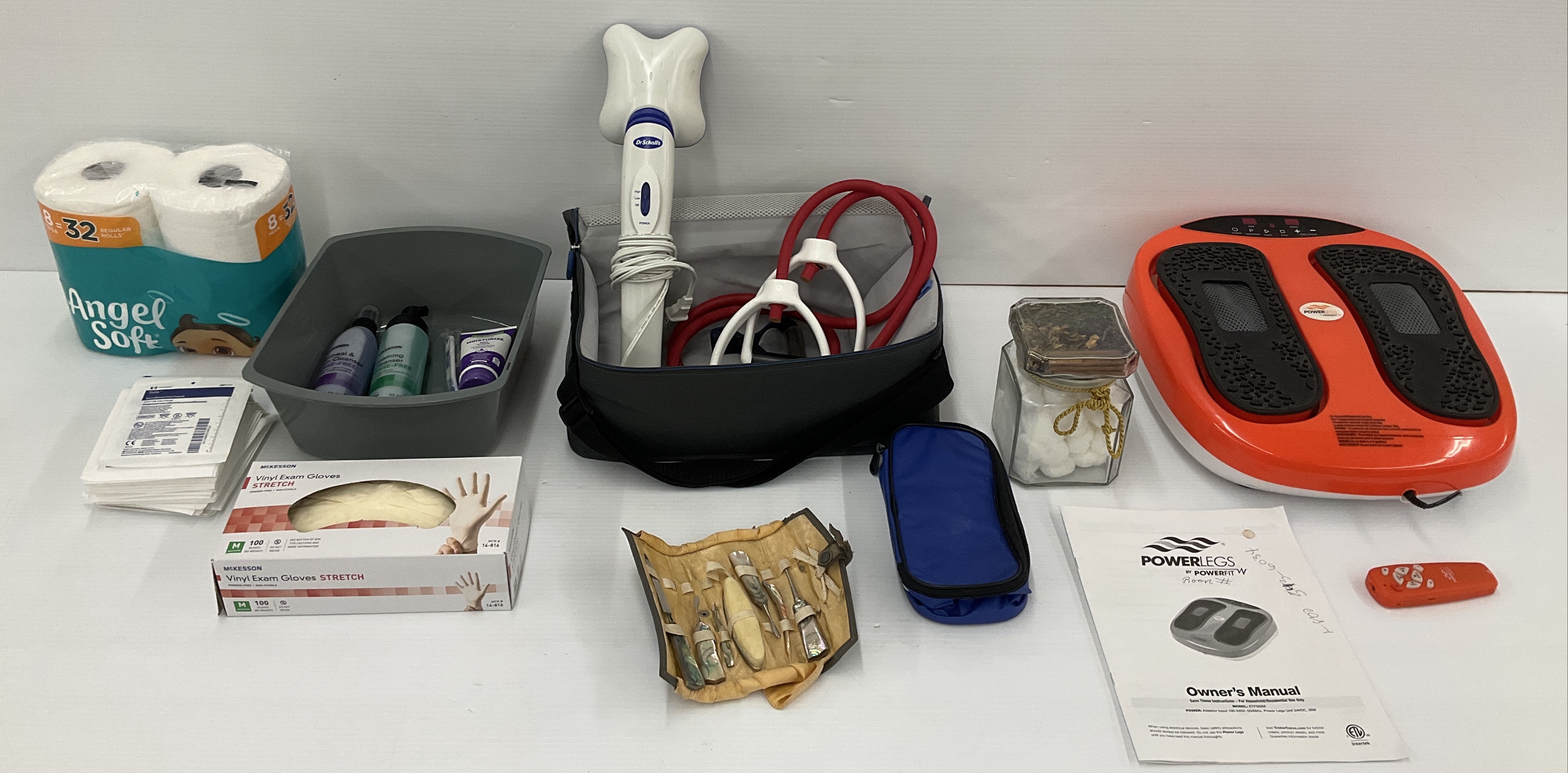 This lot includes a variety of health and wellness related items. It features a PowerLegs Powerfit vibration plate with remote and manual, along with a Dr. Scholl's device, exercise bands, exam gloves, skin cleanser, pads, and other assorted items. Also included is a vintage manicure set in a roll-up case and laundry basket.