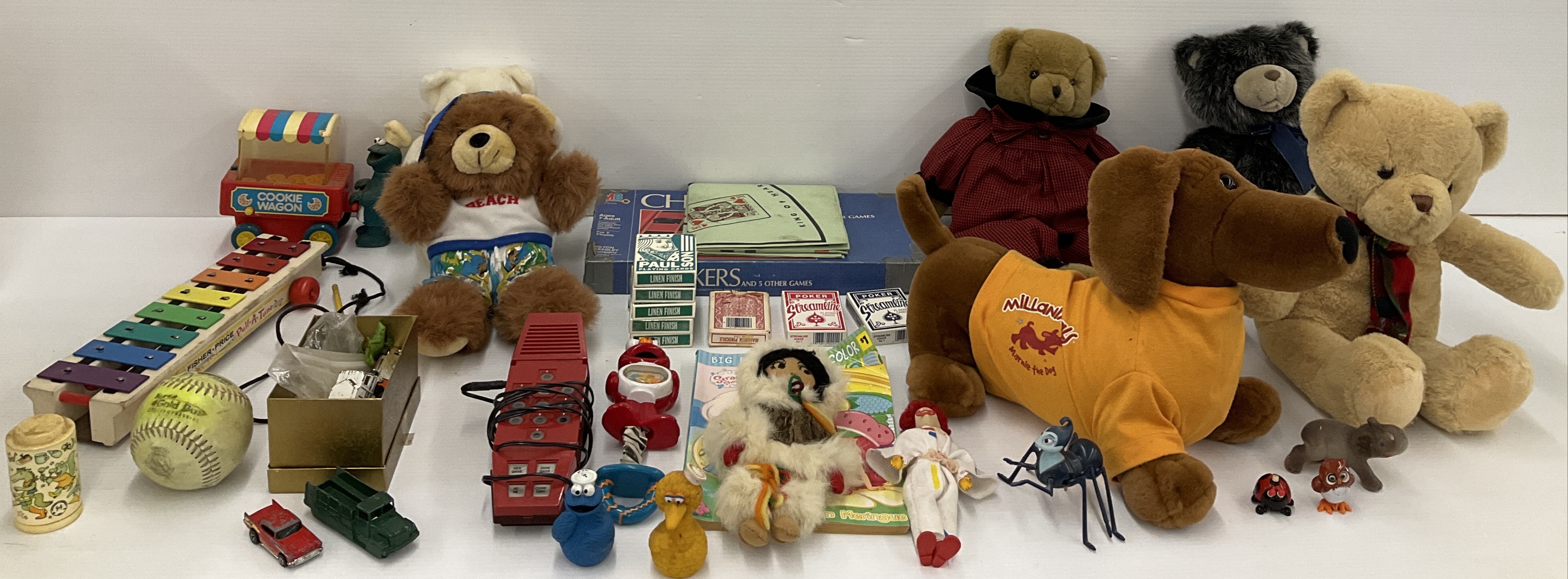 This mixed lot features a variety of toys, games, and collectibles. Includes playing cards, a Checkers board game, Hot Wheels & Midge Toy cars, a Cookie Monster toy, Fisher-Price Pull-A-Tune, Merlin Game Mindbender and other vintage toys. Longest 16.5 in.