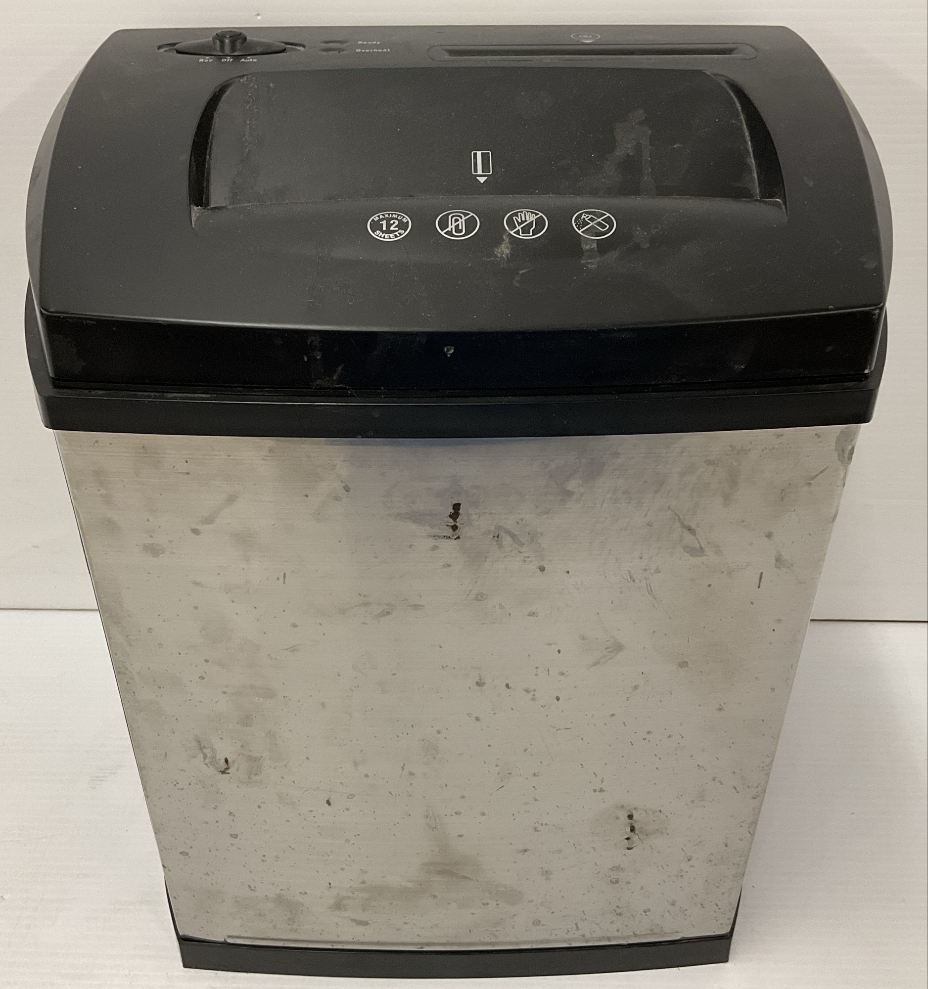 This listing is for paper shredder with a steel bin. It has a switch for auto, off, and reverse functions. It is designed to shred up to 12 sheets at a time. 17.25 x 14 x 9.25 in.
