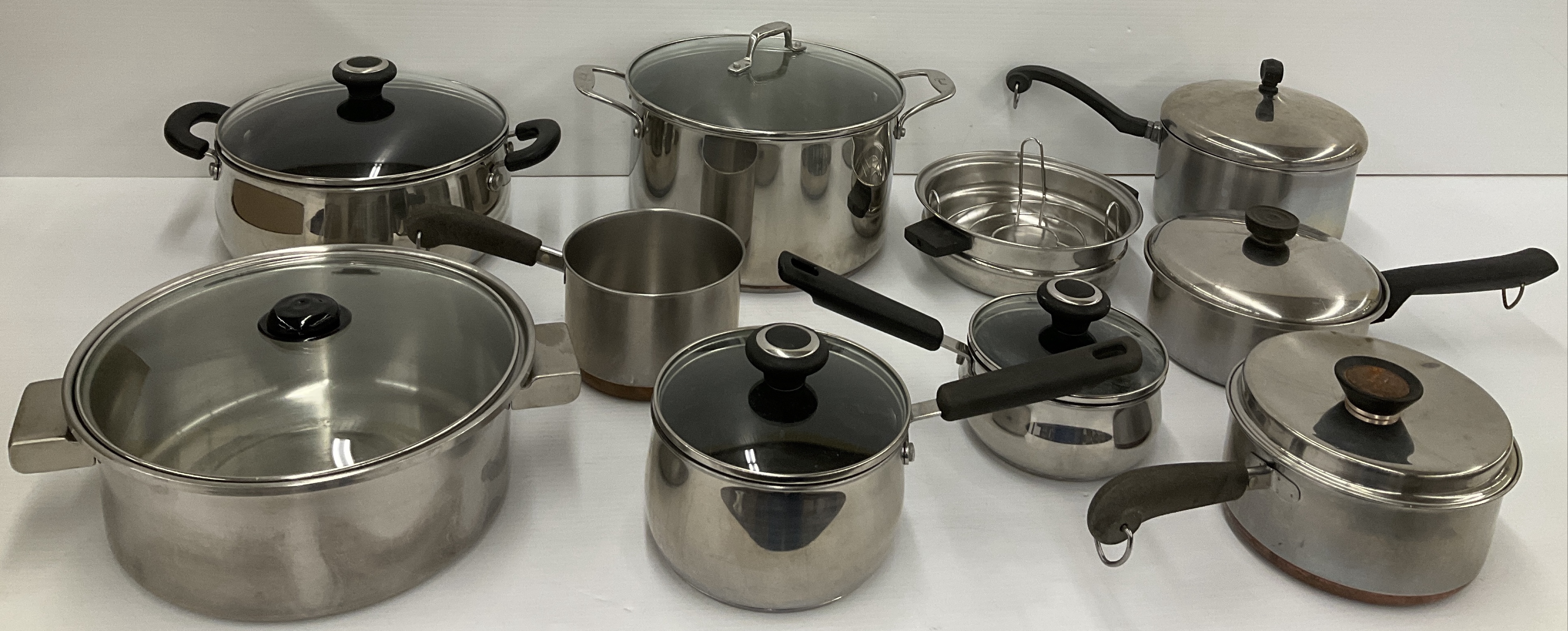 A collection of kitchen cookware including pots, pans and steamer. Brands include Kitchen Queen, Cooks Essentials, and Emeril. Includes stainless steel pots and pans of various sizes.