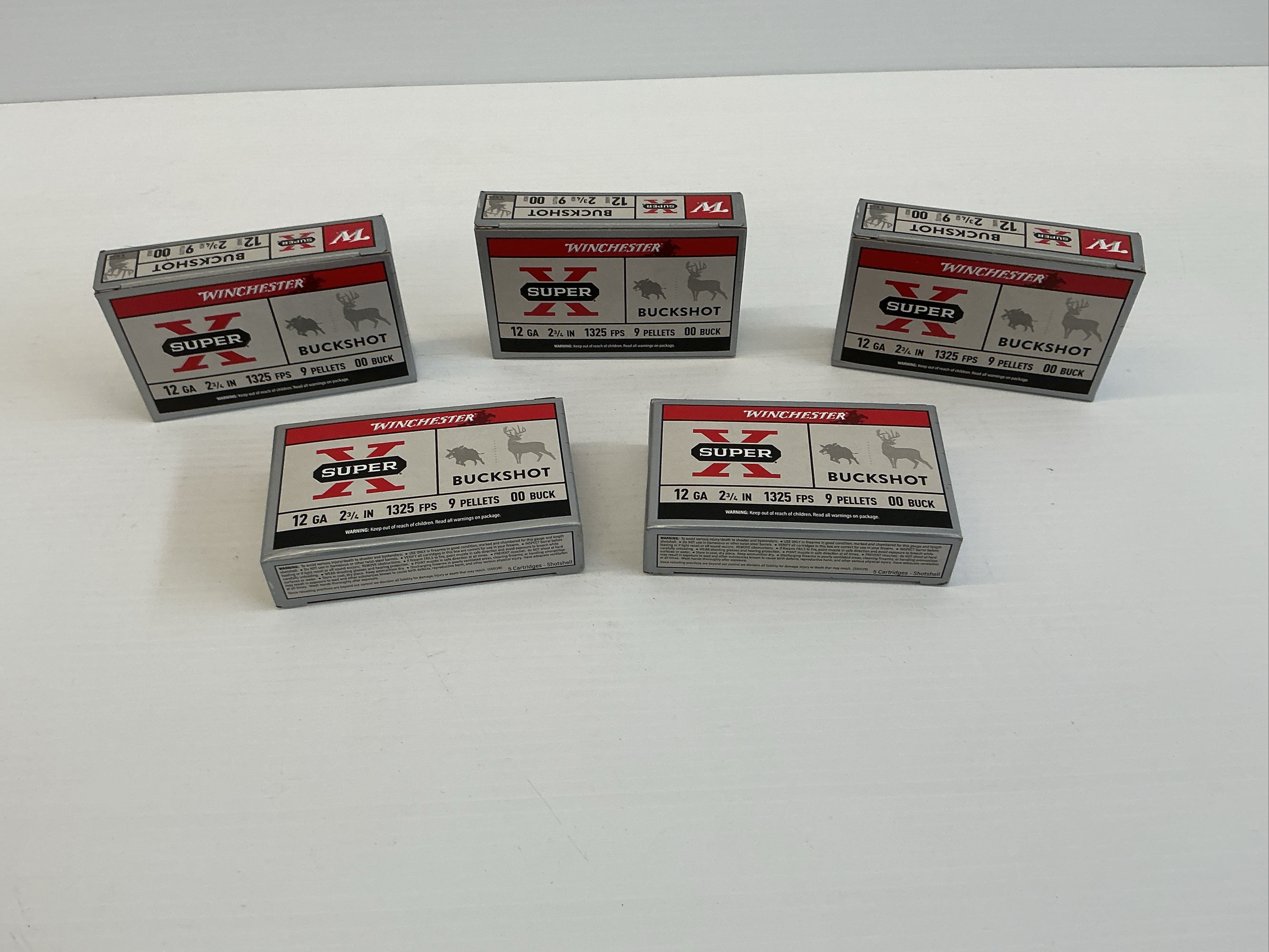 Lot of 5 boxes of Winchester Super X Buckshot 12 GA, 2 3/4 in, 1325 FPS, 9 Pellets, 00 Buck shotshells.