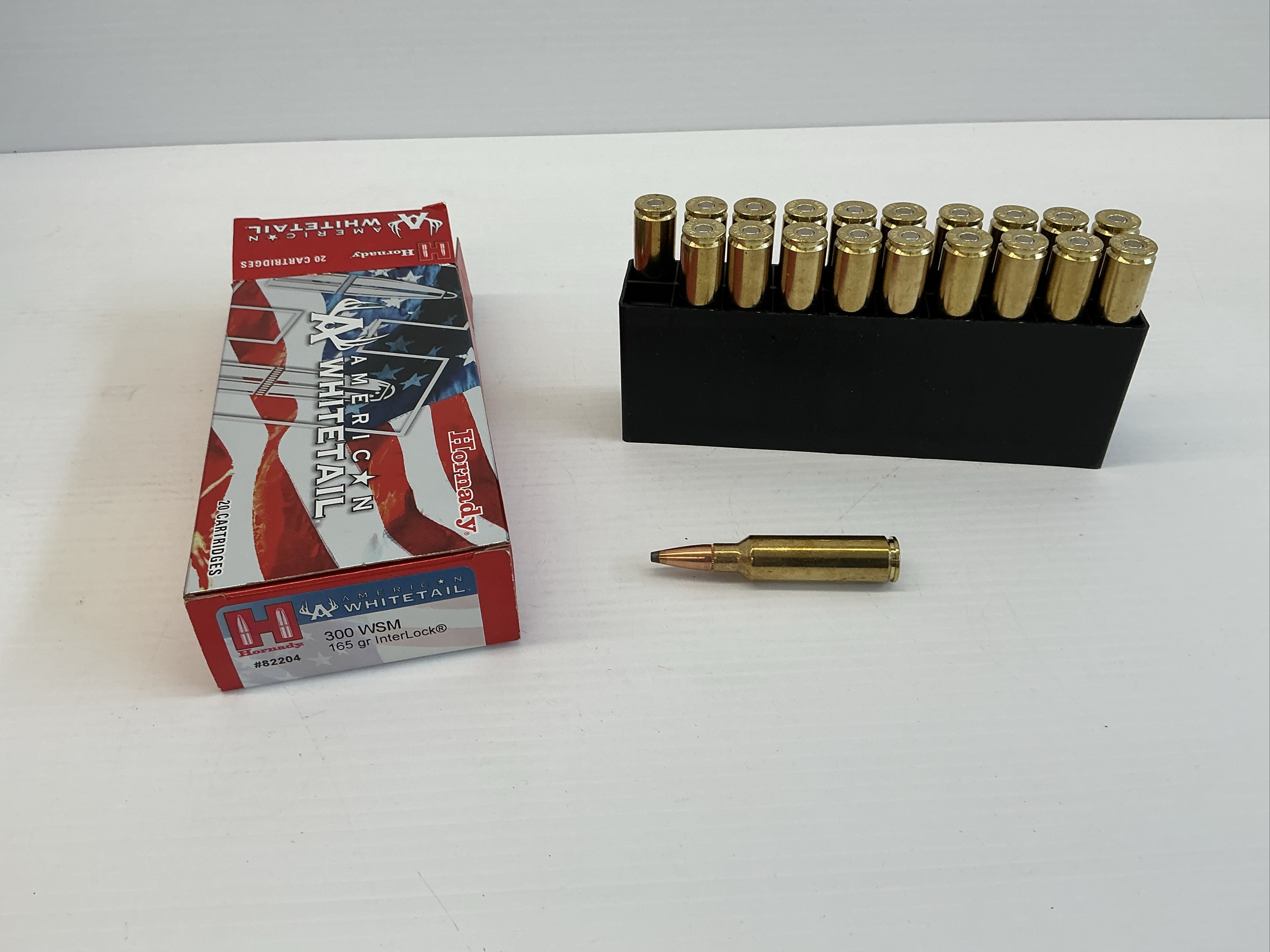 Includes a full box of Hornady American Whitetail 300 WSM 165 gr InterLock cartridges, holding 20 cartridges.