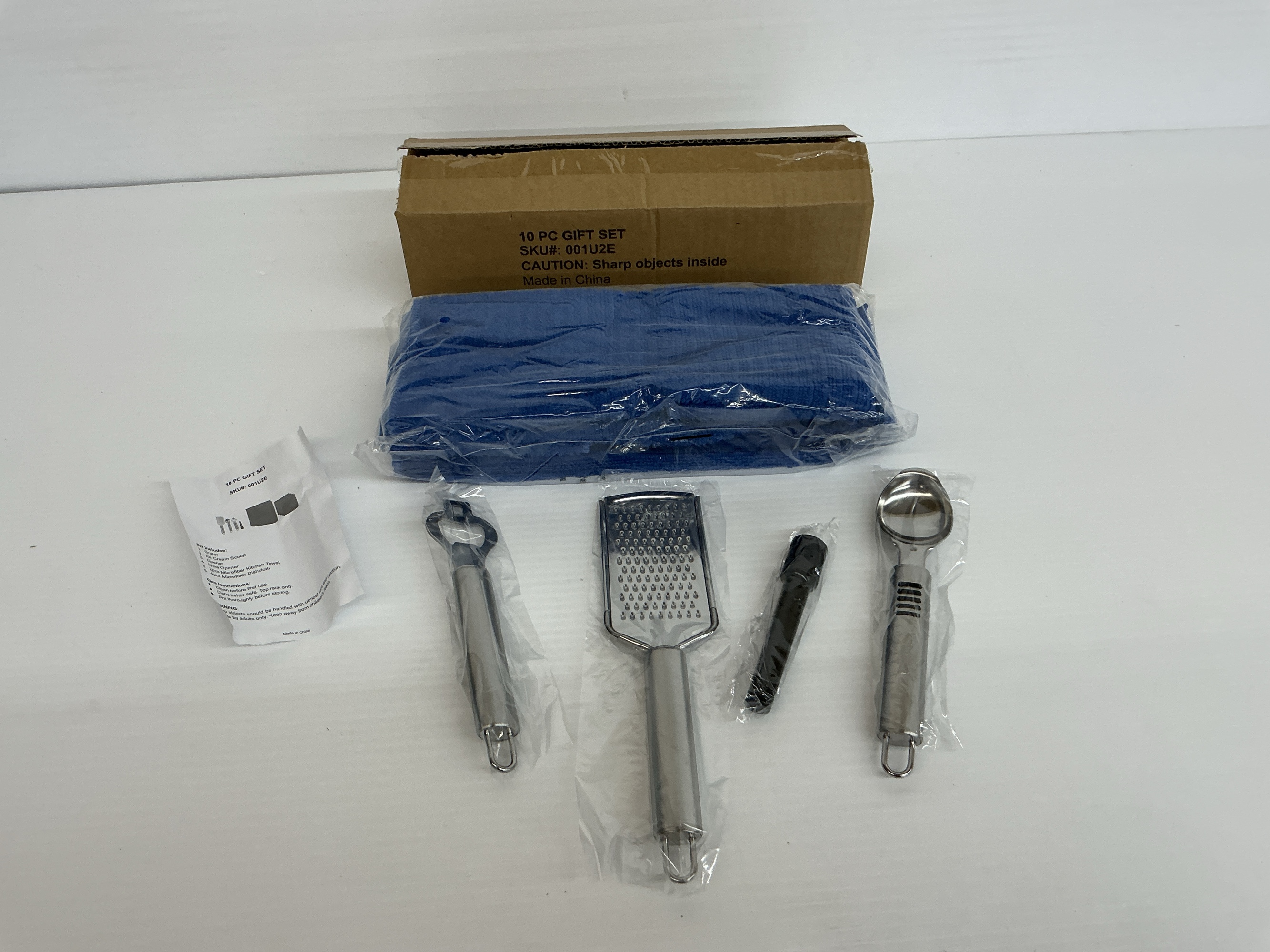 This set includes a grater, ice cream scoop, opener, wine opener, two microfiber kitchen towels, and four microfiber dishcloths.