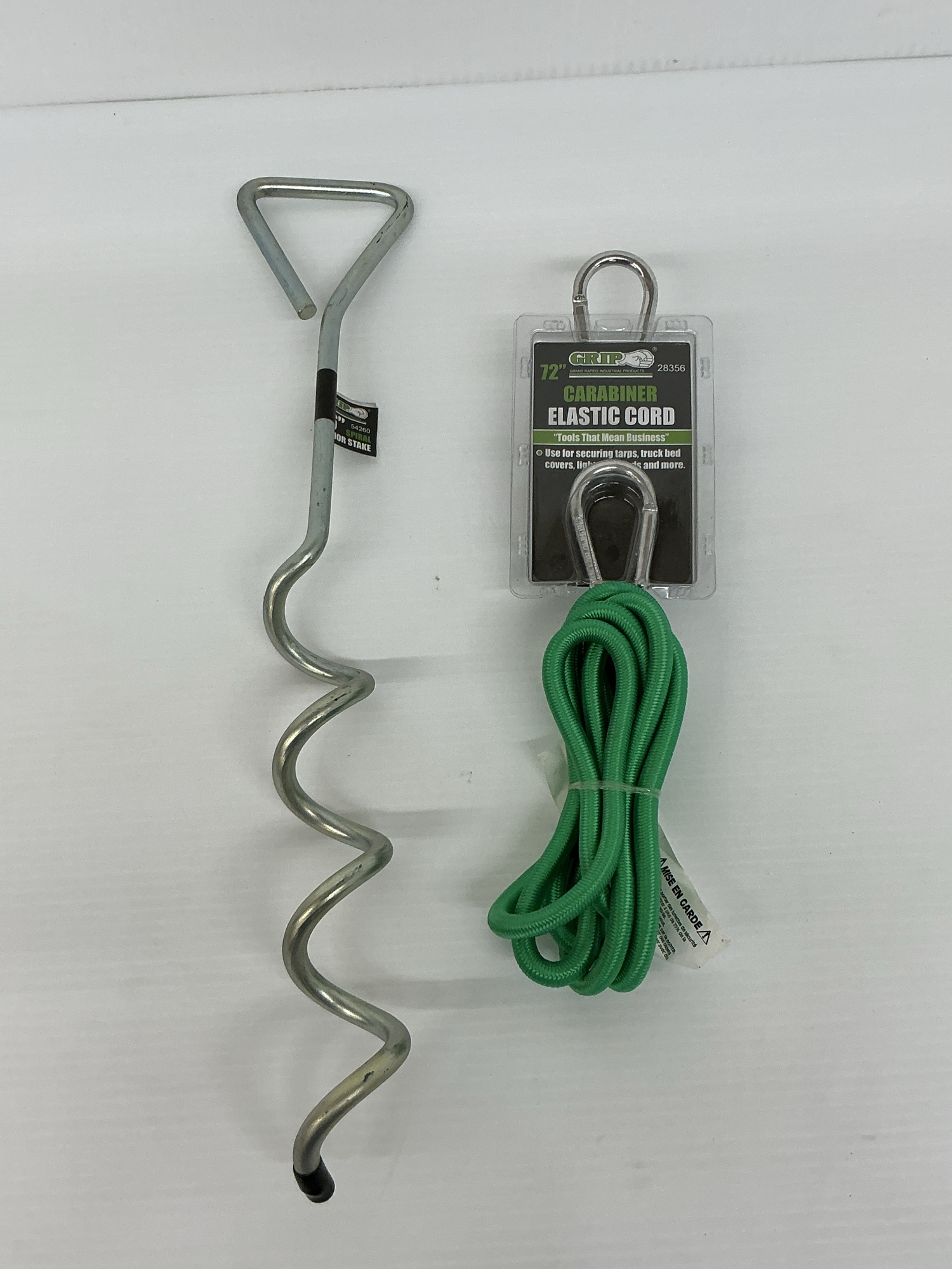 Includes a Grip 16 in. spiral anchor stake and a Grip 72 in. carabiner elastic cord. The elastic cord is described as 'Tools That Mean Business' and for securing tarps, truck bed covers, light loads, and more.