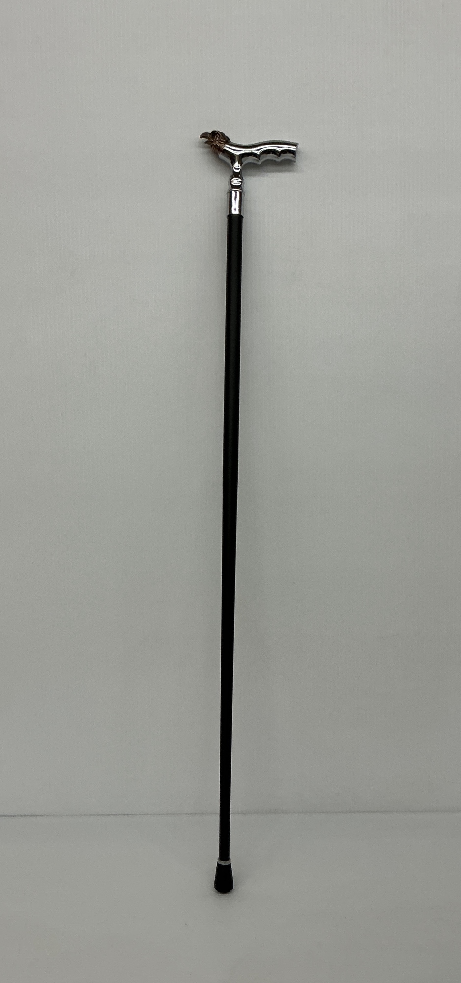 A decorative walking stick featuring a polished metal eagle head handle, black shaft and rubber tip. 37 in. long