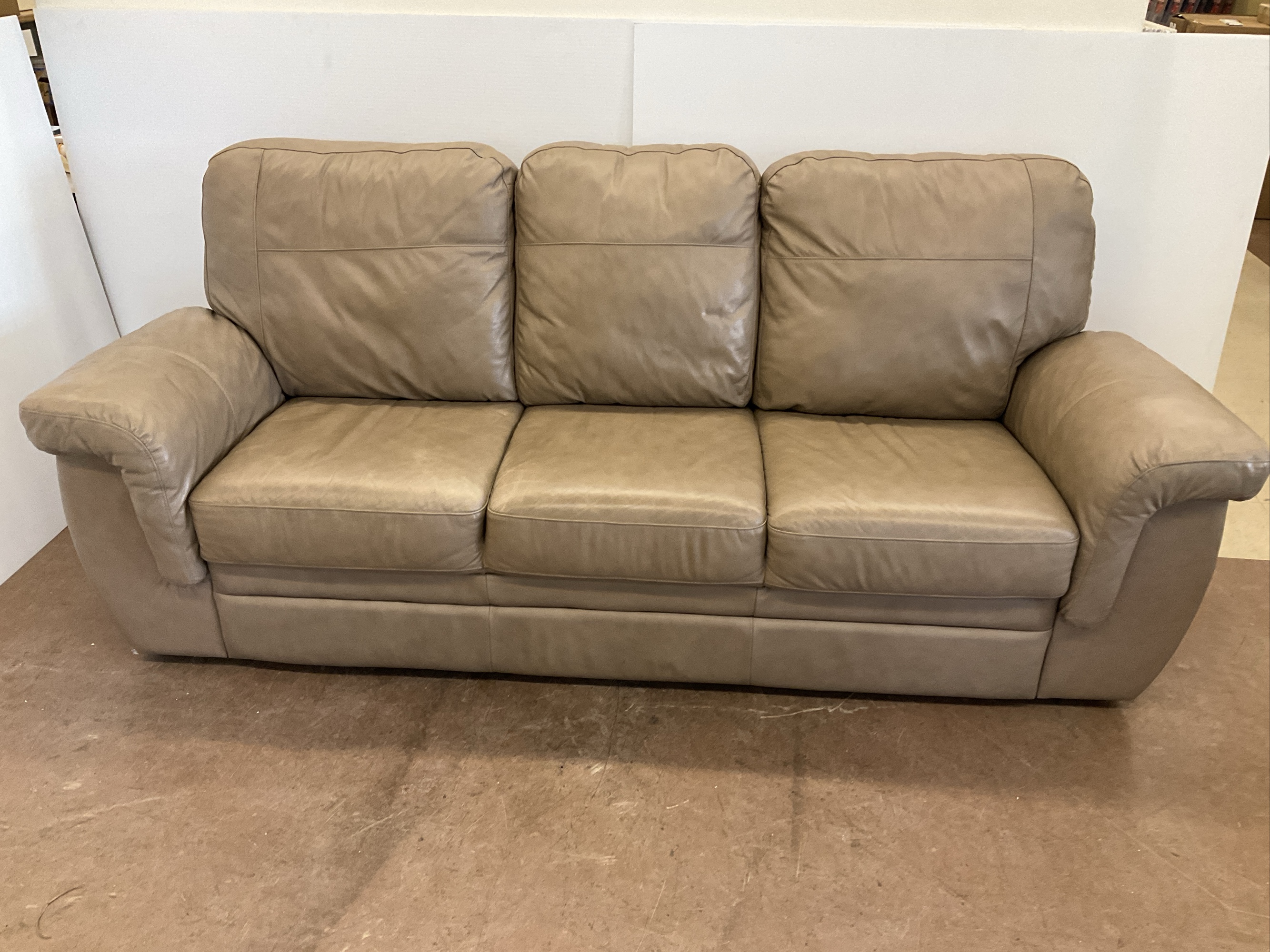 Comfortable tan leather sofa, perfect for a living room or den. Features a traditional design with cushioned back and armrests. 39 x 88 x 36 in. Matches lot 253.