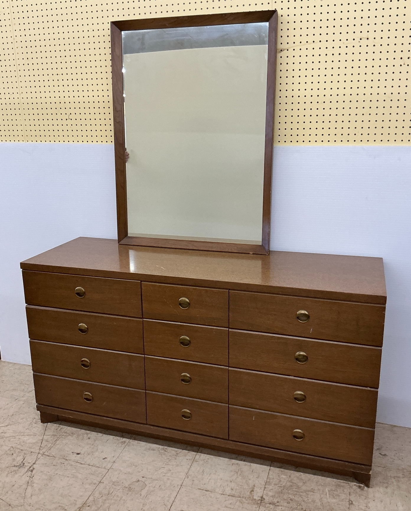 This auction is for a dresser made by Bassett Furniture Industries. It has multiple drawers and comes with a mirror (no mounting hardware). Approximate dimensions are 30 x 56 x 18 in.