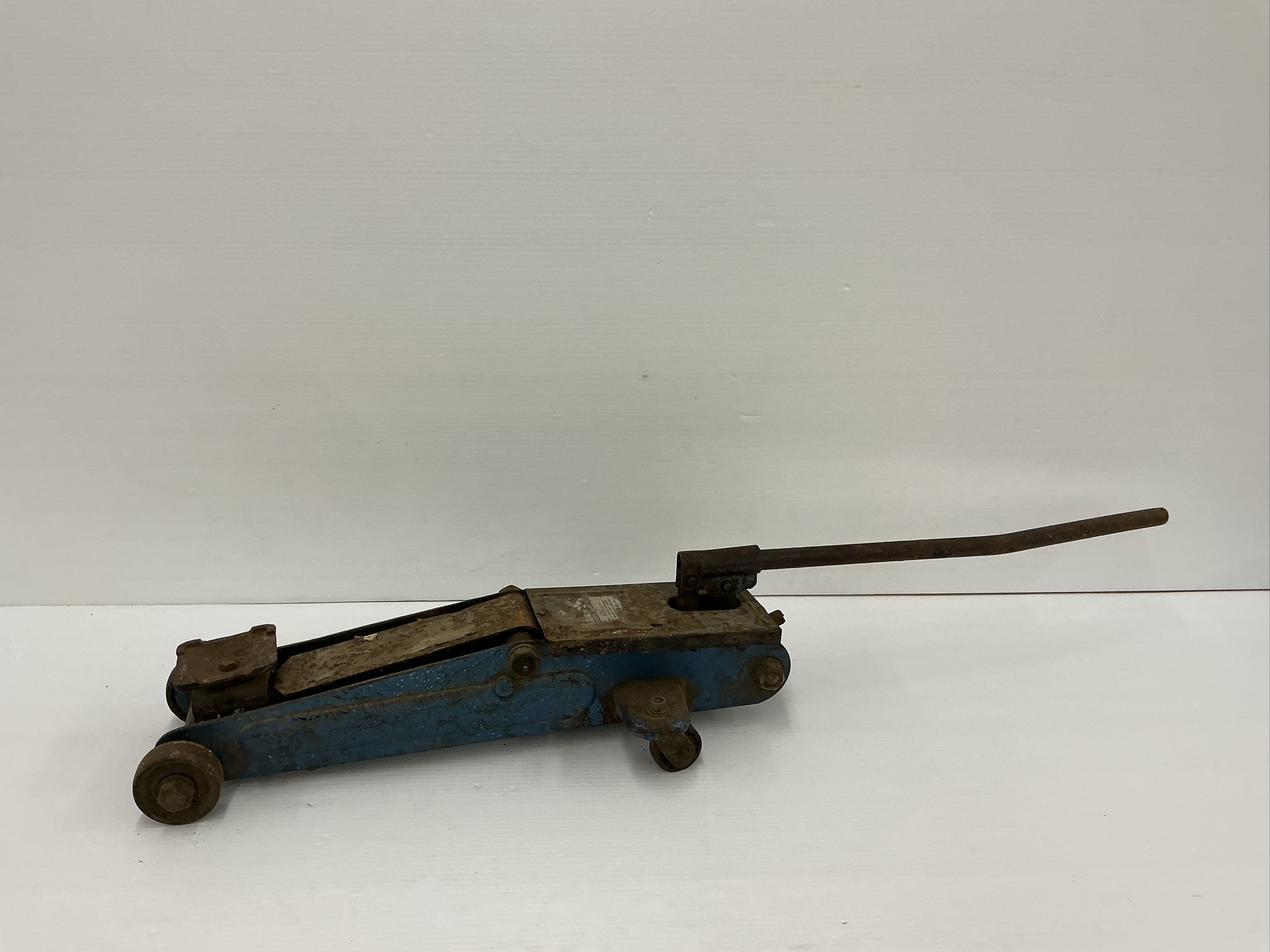 This is a used hydraulic floor jack. It is painted a light blue color. It is a compact unit and would be suitable for home or shop use. 24 x 45 x 12 in.