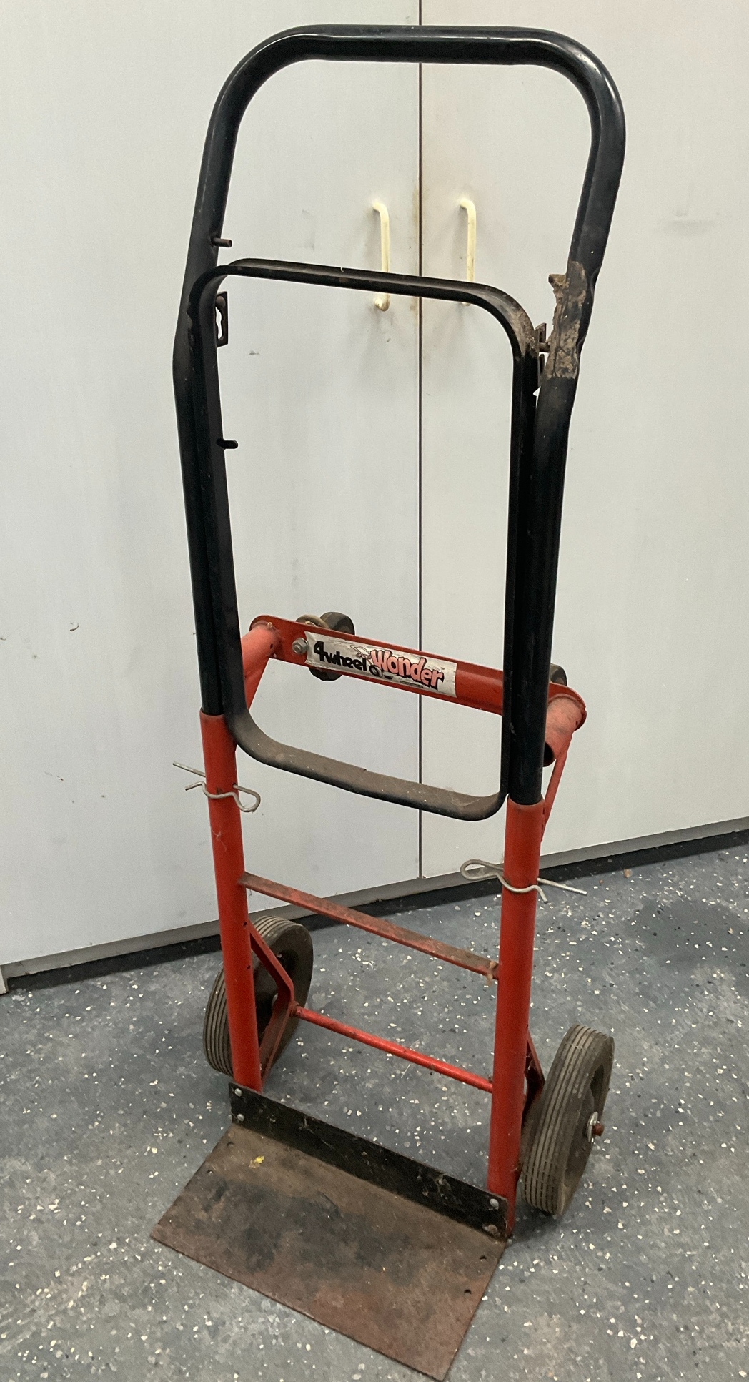 This is a 4-wheel wonder hand truck. It is red and black in color. Let this dolly do the hauling work for you!