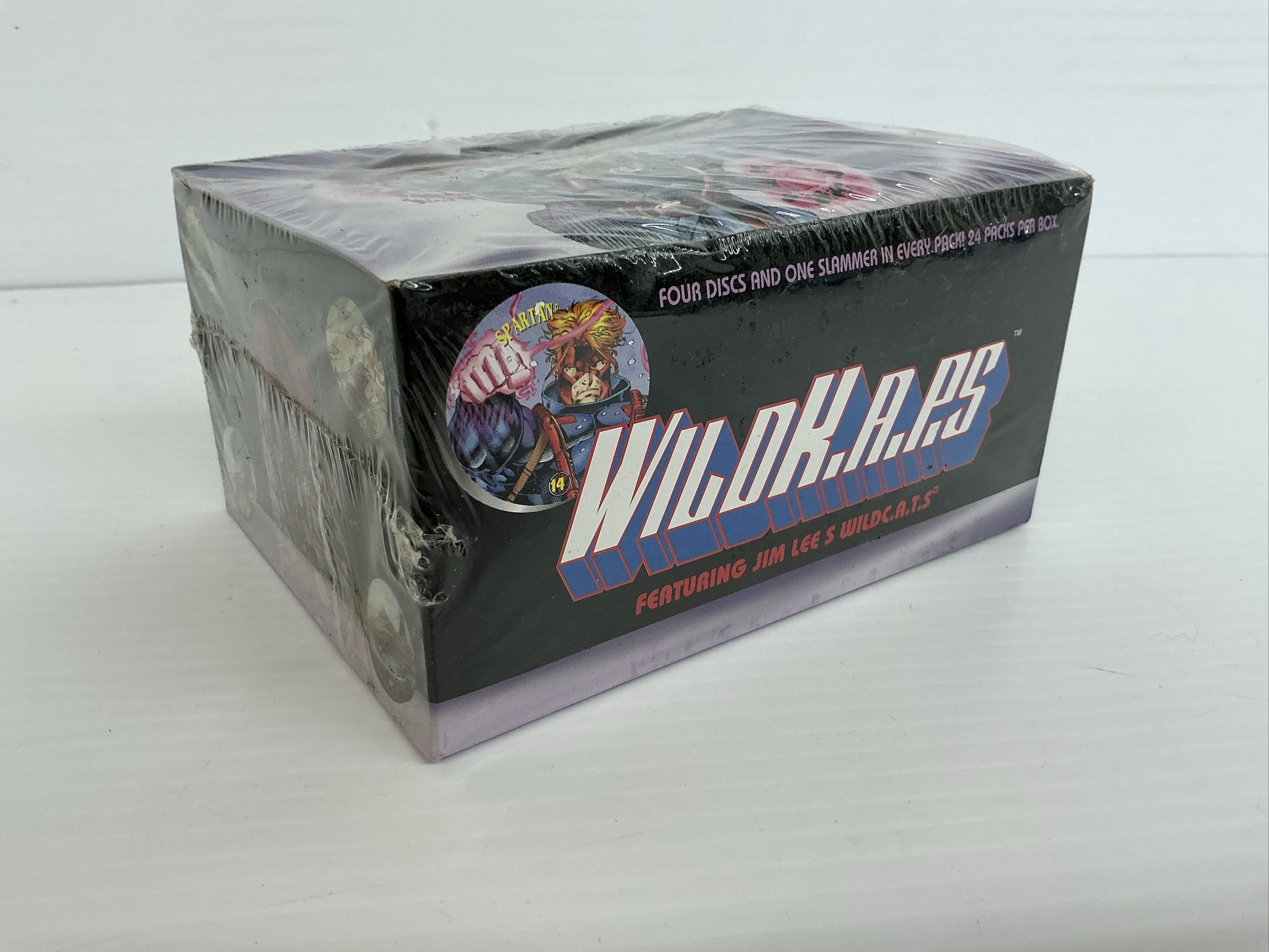 This is a sealed box of WildK.A.P.S trading pogs, featuring art by Jim Lee. Each box includes Four Discs and One Slammer in Every pack; 36 Packs Per Box.
