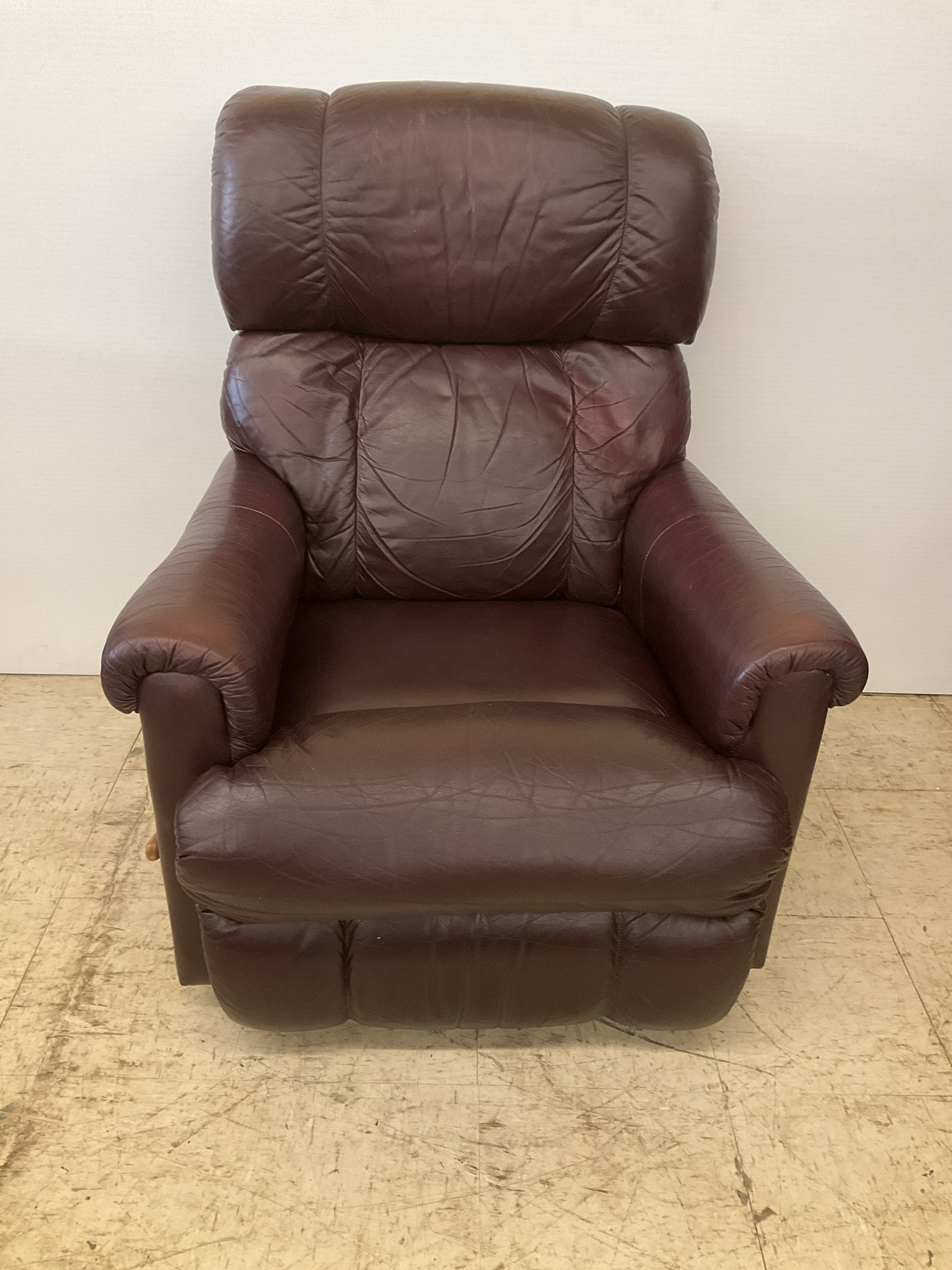 This is a La-Z-Boy rocker recliner covered in a burgundy colored leather. The handle of the recliner is wooden. Overall dimensions are 40 x26 x 29 in.