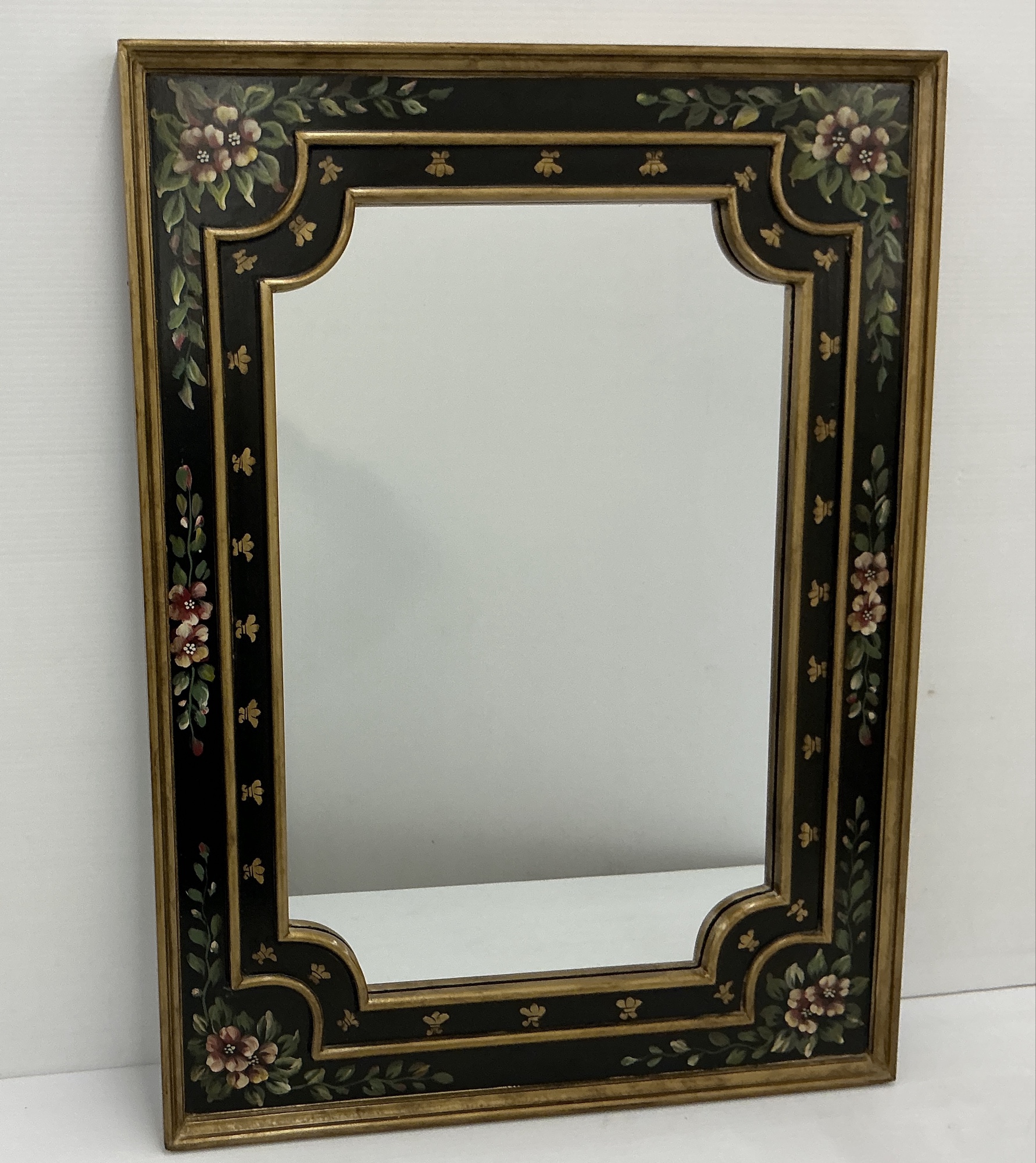 This is a beautiful decorative wall mirror featuring a black frame accented with a gold trim. The frame is adorned with a painted floral design, giving it an elegant touch. 32 x 23.5 in.