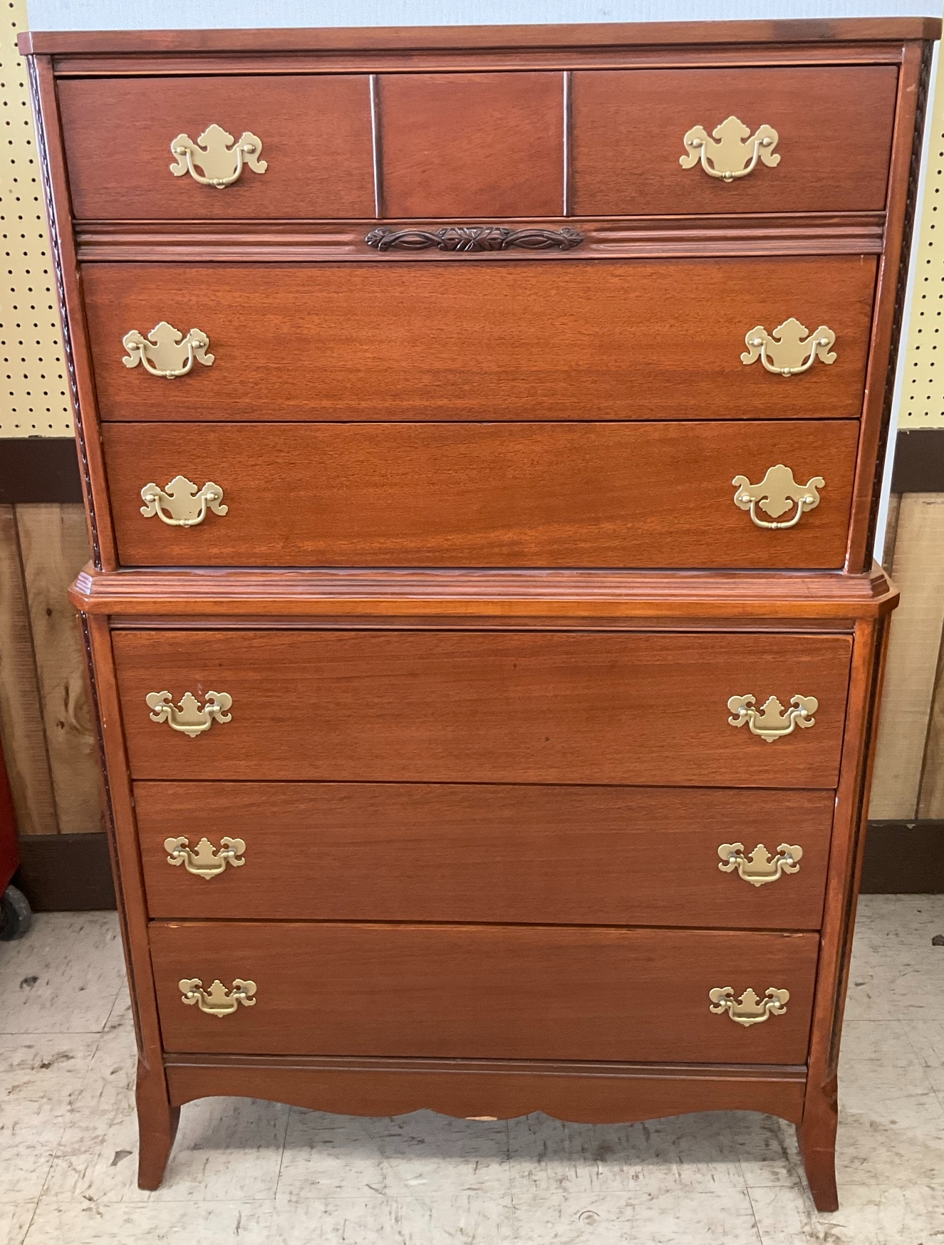 Chest of drawers featuring wooden construction, multiple drawers, and decorative hardware. Solid bedroom storage. 54 x 34 x 20 in.