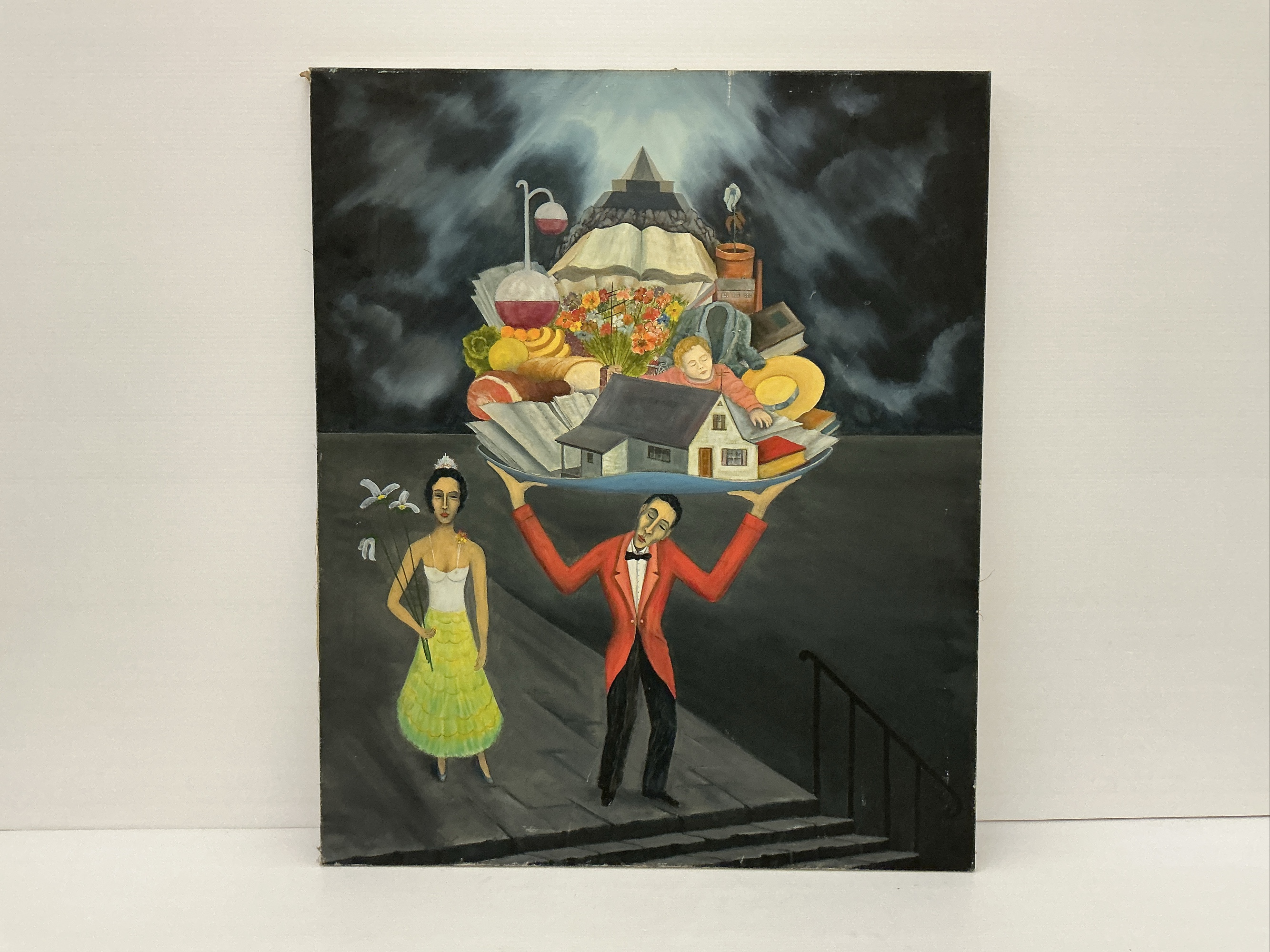 An oil on canvas painting featuring a surrealist style composition with figures and objects in an intriguing arrangement. The painting depicts a man in a red suit holding a tray laden with various items, while a woman stands nearby. The artwork has a distinctive artistic style and could be a unique addition to any collection. 36 x 30 in.