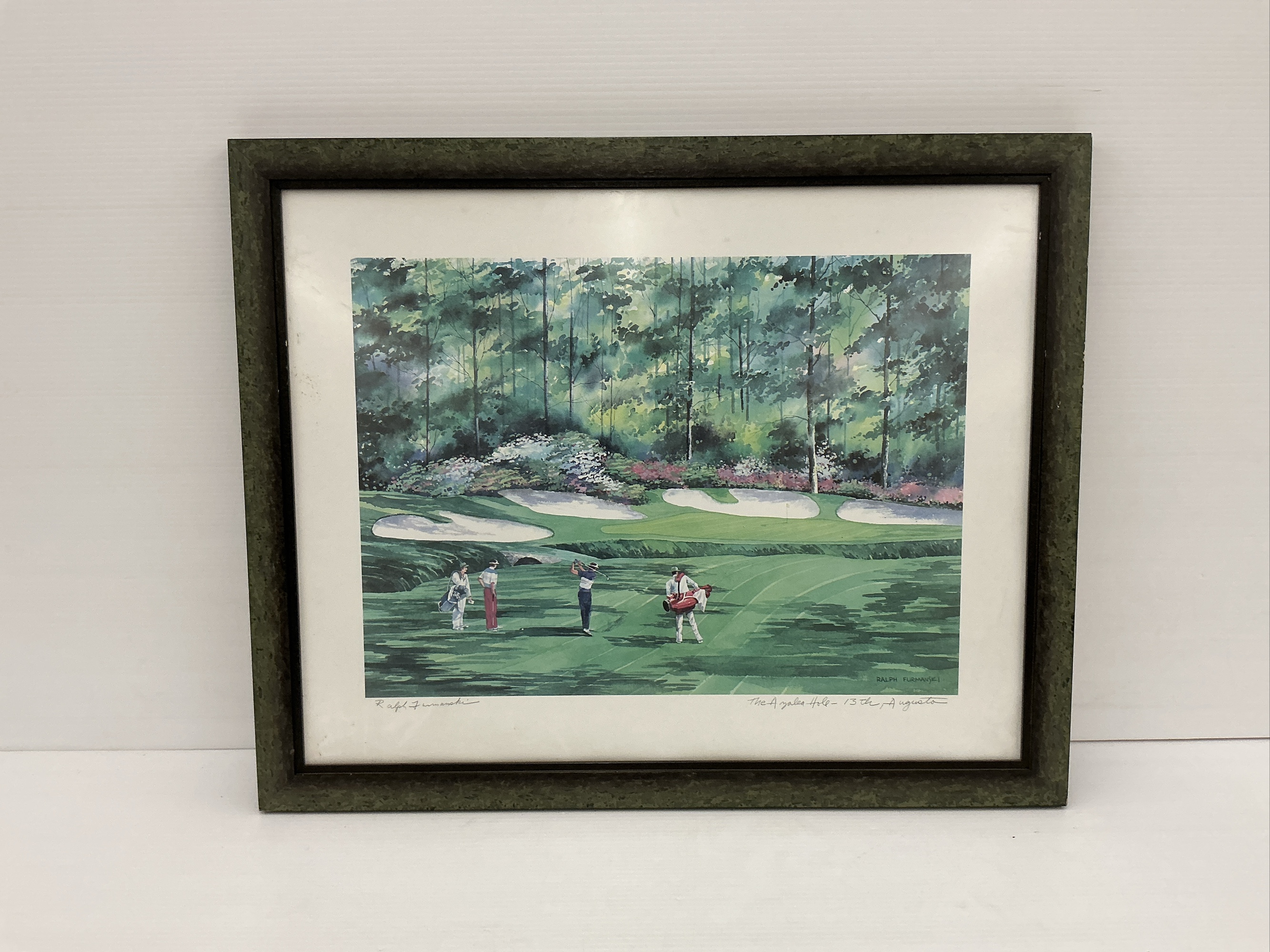 Framed print signed by Ralph Furmanski, depicting The Azalea Hole, 13th hole at Augusta National Golf Club. The print is framed and ready to hang. Features golfers and the signature of the artist. 23 x 28 in.