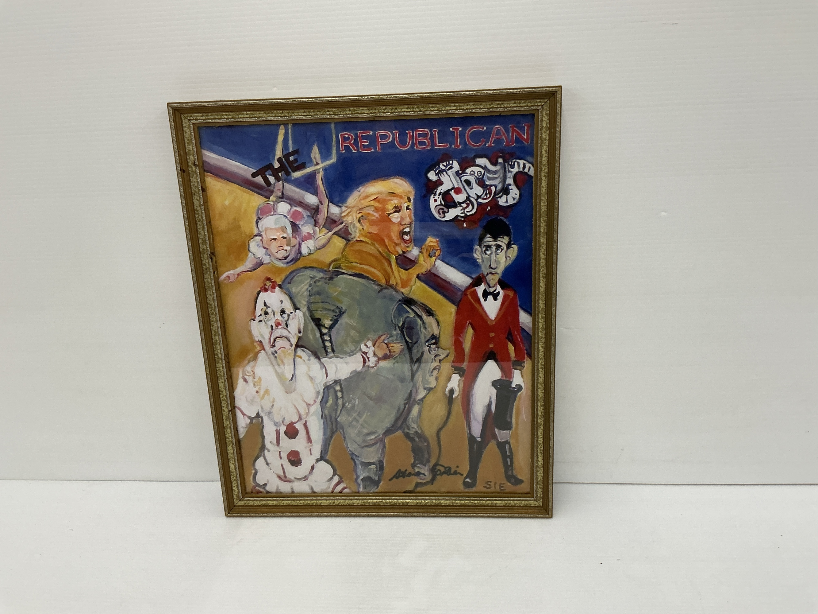 This framed painting features a satirical depiction of the Republican party with an elephant, clown and ringmaster figure. The artwork includes the word 'Republican' and is signed by the artist. 22 x 18 in.