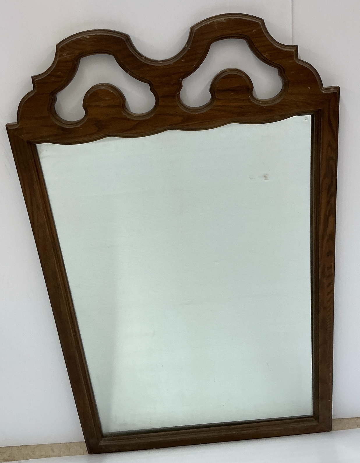 This is a Carolina Mirror Company wood framed mirror. The frame has decorative shapes on the top. 51 x 32 in.
