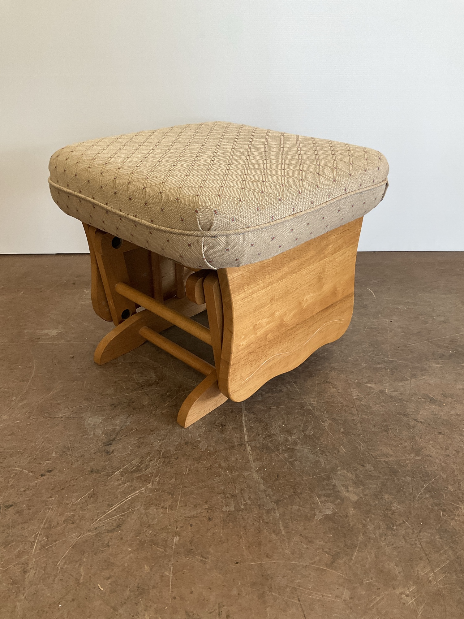 This is a gliding ottoman featuring a light wood base and a padded cushion with a subtle geometric pattern. Dimensions are 16 x 20 x 19 in.