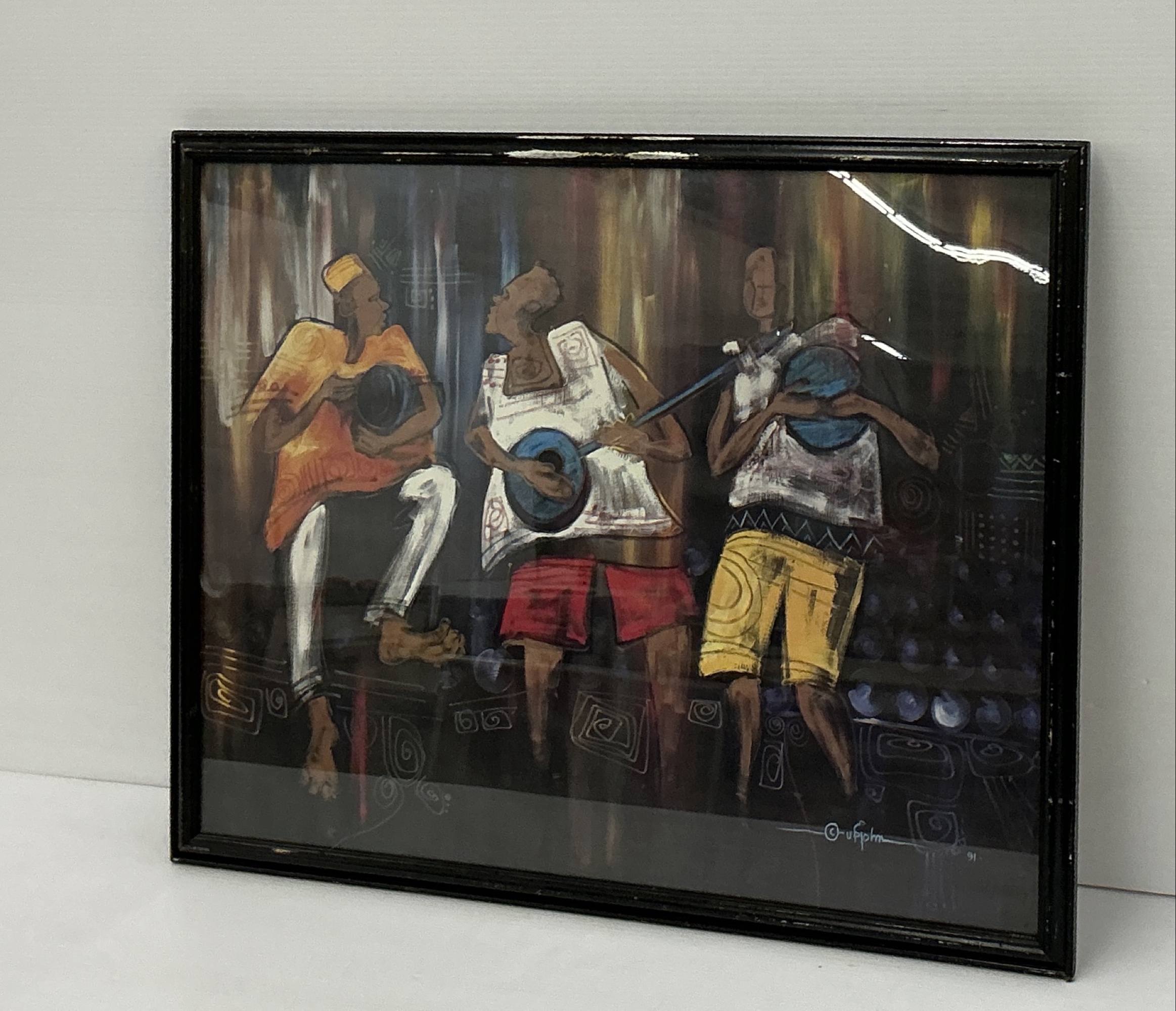 Framed print featuring an abstract painting of a band. The artwork is signed by the artist "Upjohn" and dated 1991. The print is encased in a black frame and ready to hang. 24 x 30 in.