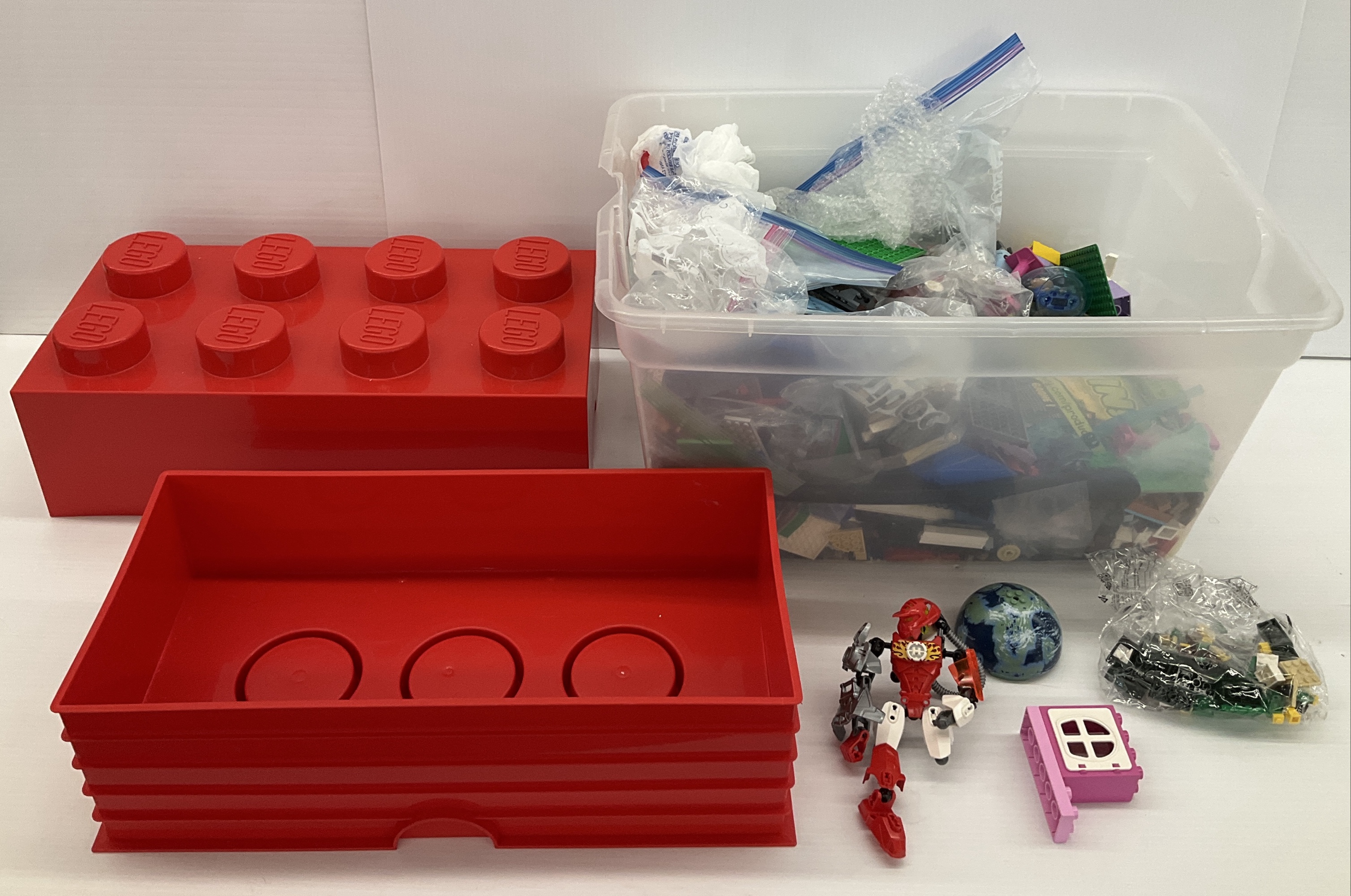 This lot includes a variety of Lego pieces, including a Bionicle figure, a building brick-shaped storage container, and other Lego elements. Perfect for adding to your Lego collection. Storage bin 7 x 19 x 9.25 in.