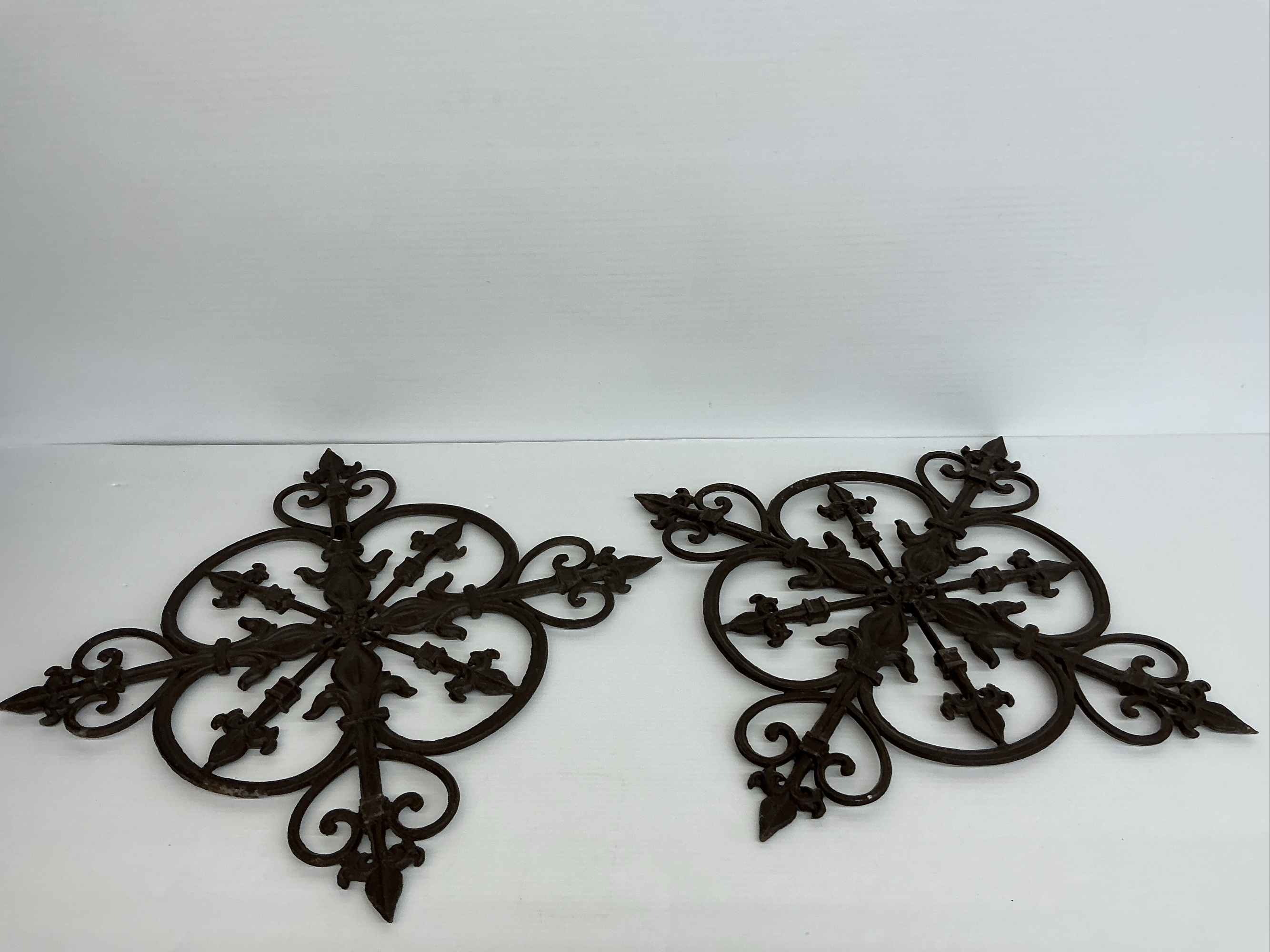 These metal wall ornaments have an ornate floral and scroll design. These pieces are heavy.