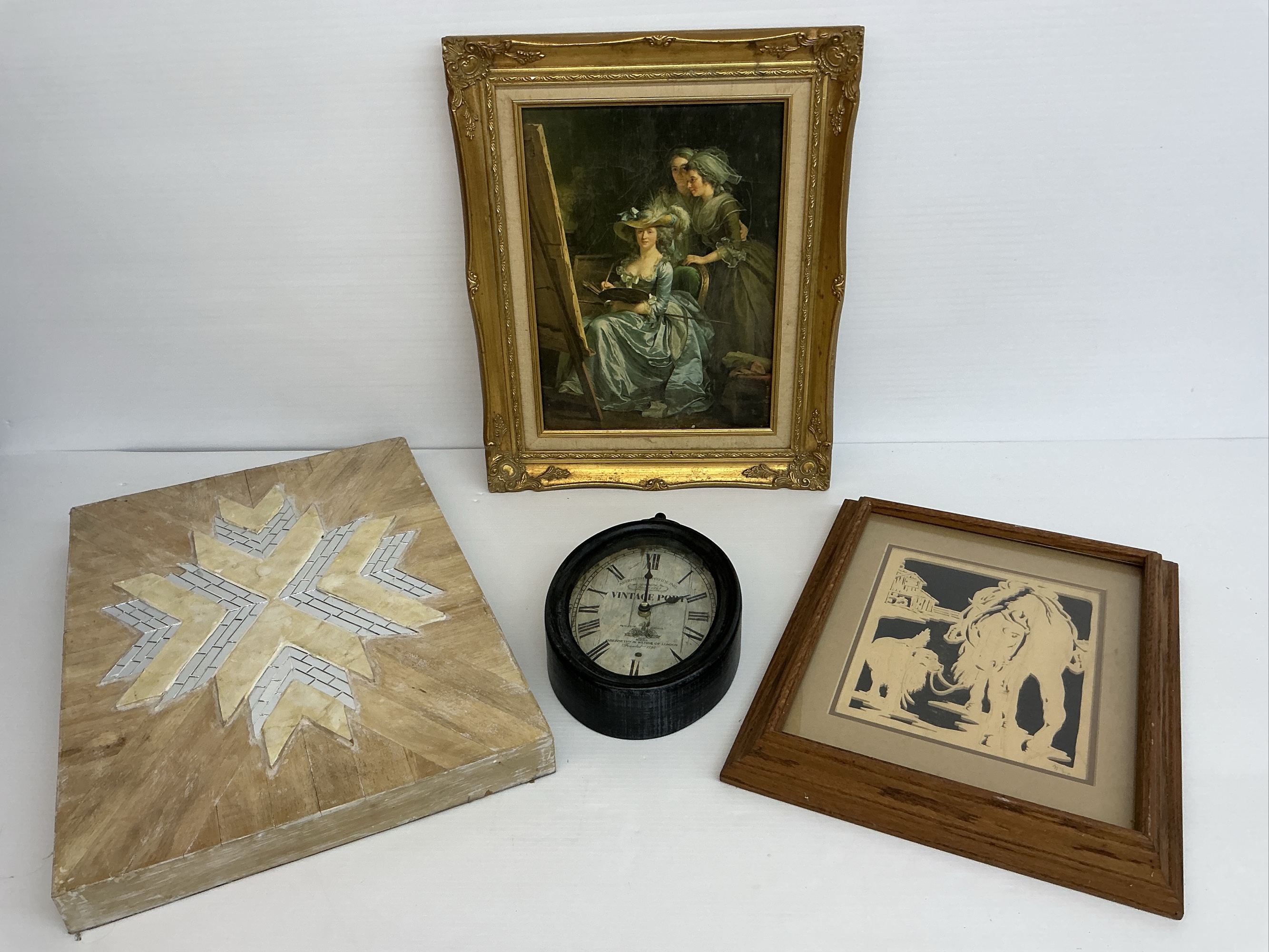 This lot includes a framed painting of a woman with two other women looking on, a black framed wall clock with Roman numerals, a wooden box with a starburst design, and a small framed art piece of a dog with a draft horse. We do not guarantee clocks to work. Largest piece is 24 x 16 in.