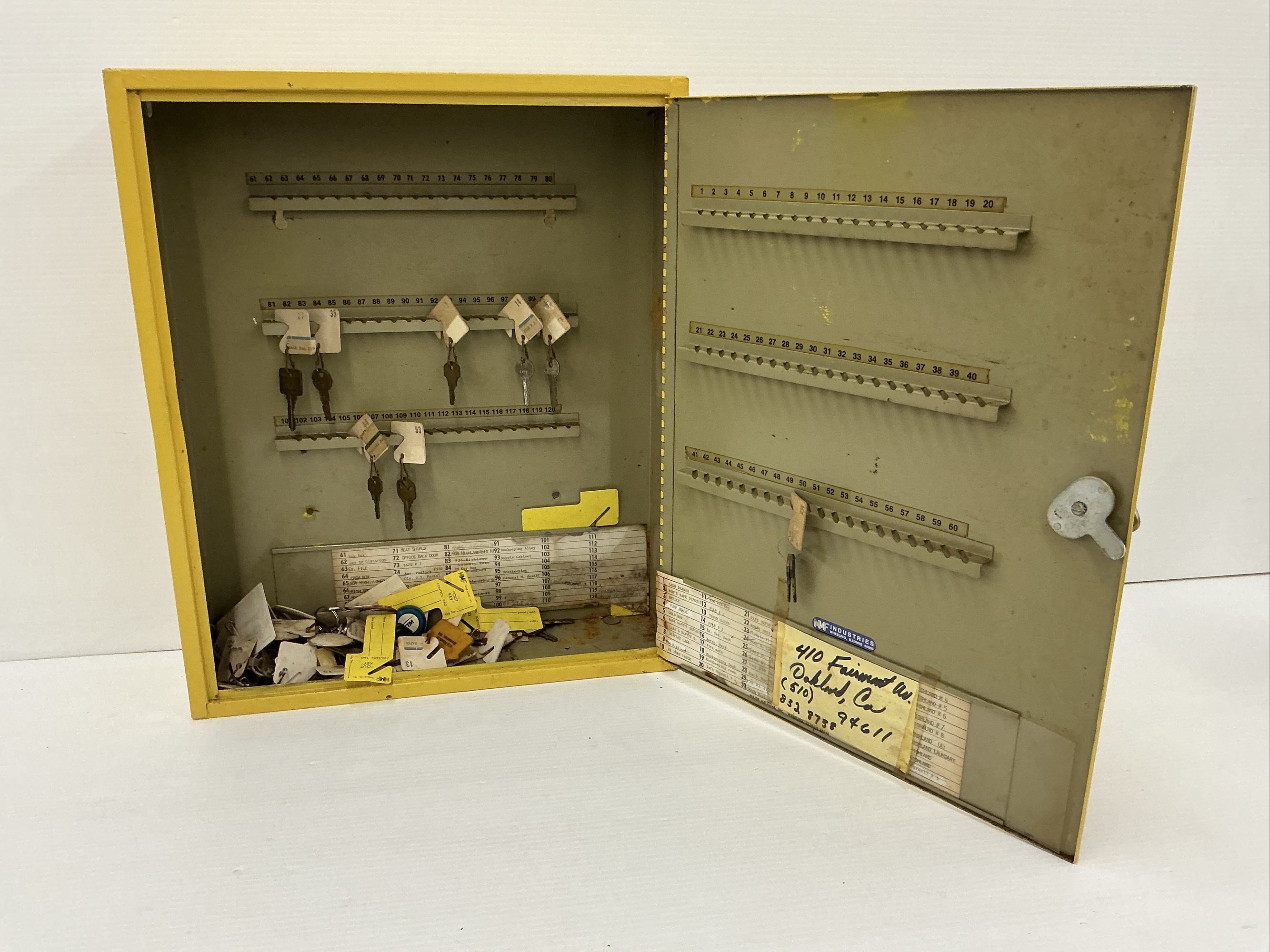 Yellow metal key storage cabinet containing a large assortment of keys. The cabinet has numbered hooks for organizing keys and includes a lock with keys. 20.5 x 16.5 x 7.5 in.