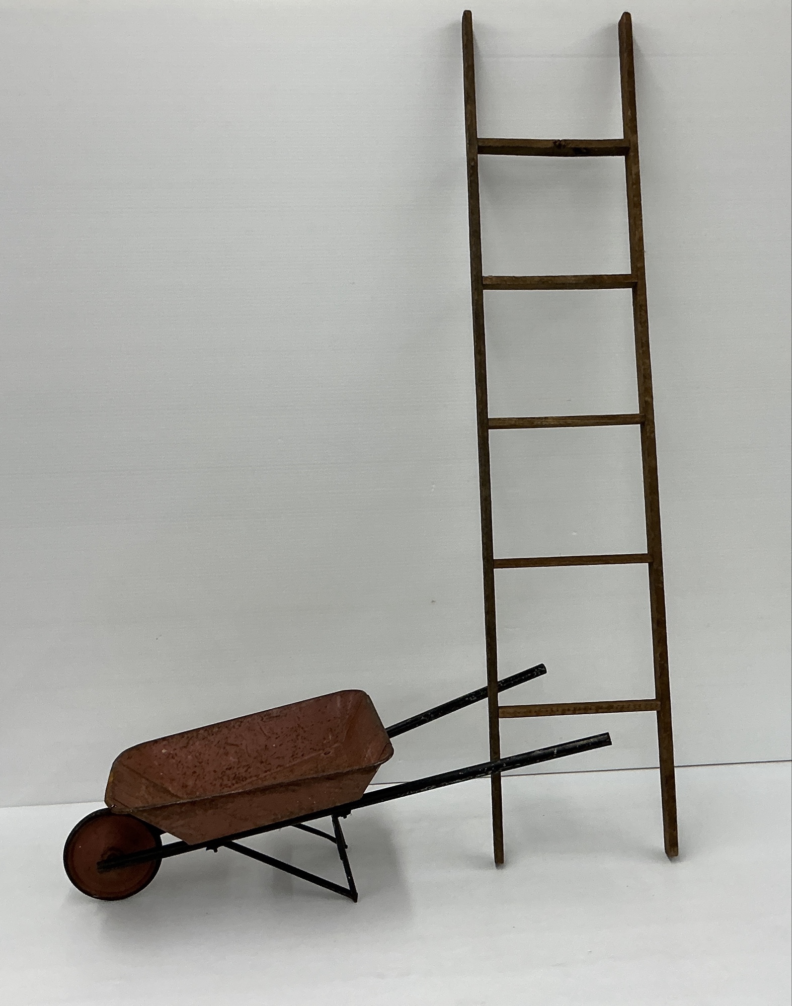 Includes a metal toy wheelbarrow and wooden ladder. Wheelbarrow has some rust. Ladder 48 x 10 in.
