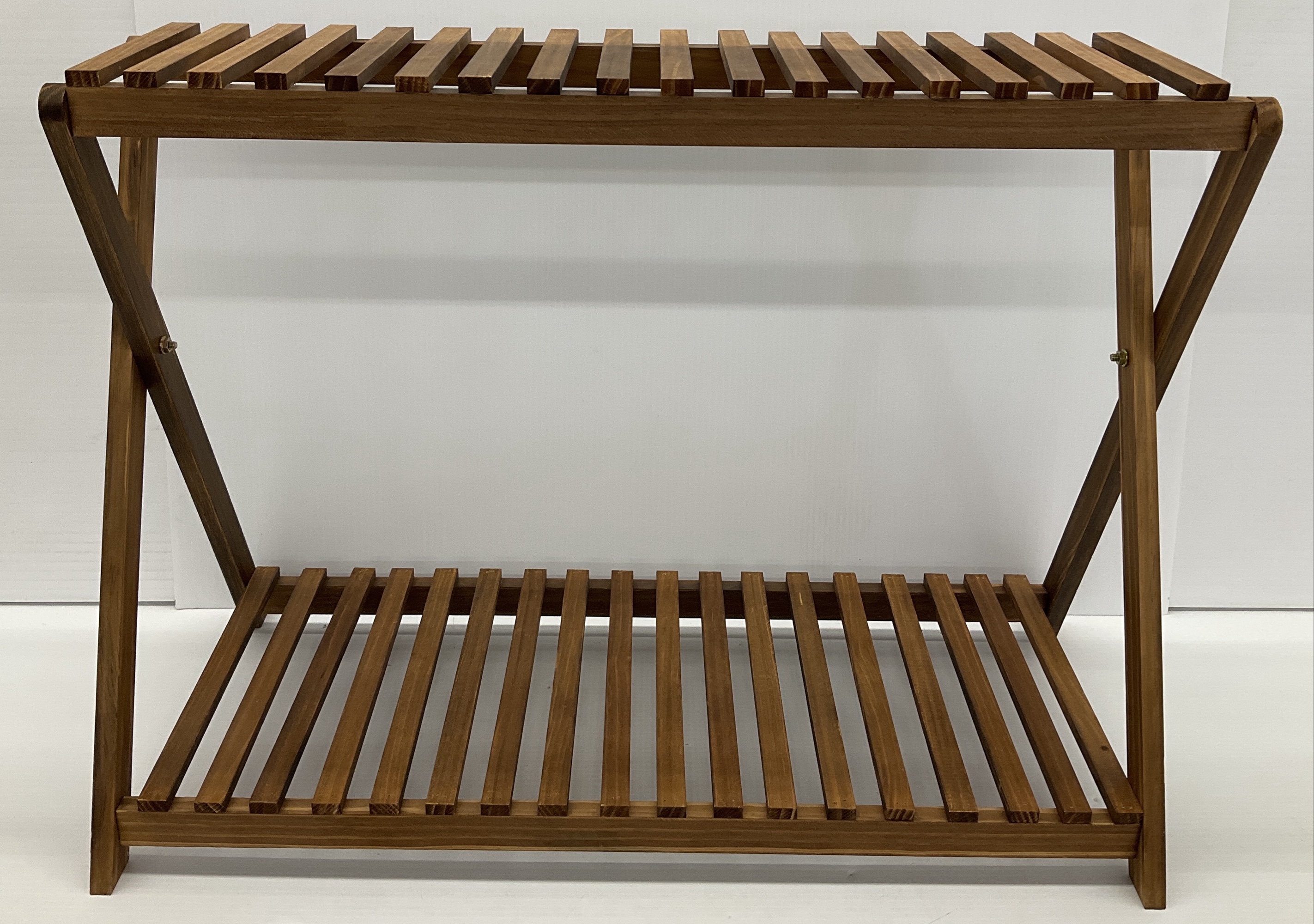Wood folding 2-tier shelf stand for versatile storage and display in any room. The shelf folds for easy storage when not in use. 21.5 in. tall