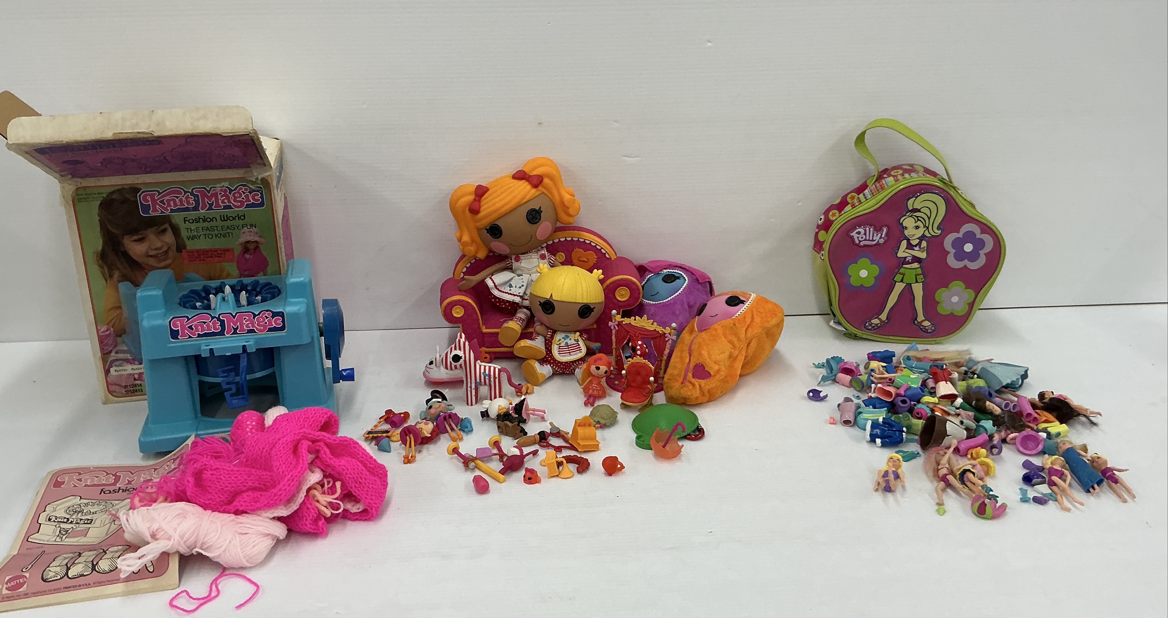 This lot features an assortment of toys including Lalaloopsy dolls with accessories, Polly Pocket dolls and clothing inside a carrying case, and a vintage Knit Magic knitting machine.