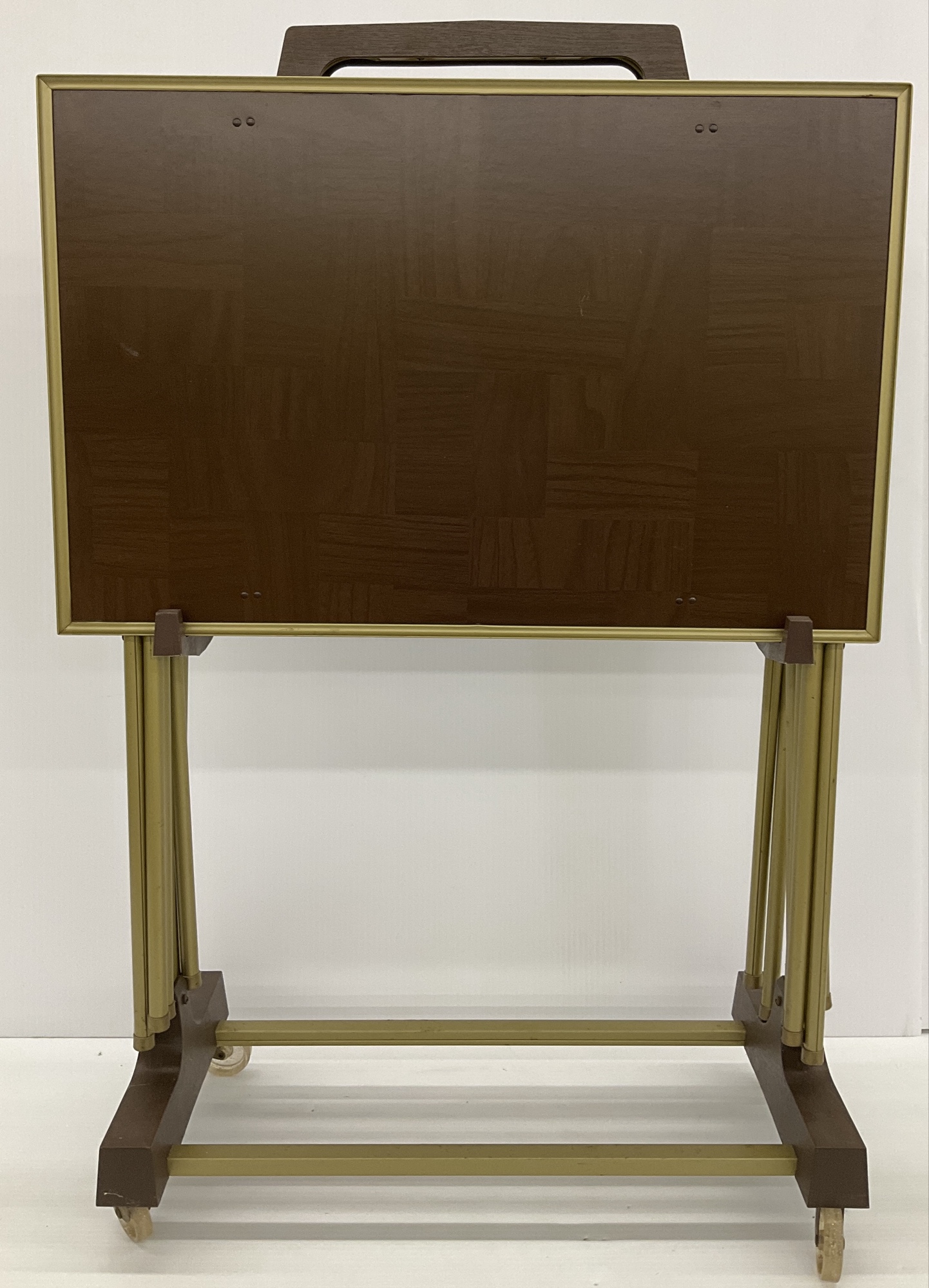 This listing is for a set of four TV tray tables, each featuring a brown tabletop with a gold-colored frame and collapsible legs. The set includes a matching rolling cart for easy storage and transportation. Cart 43.25 in. tall