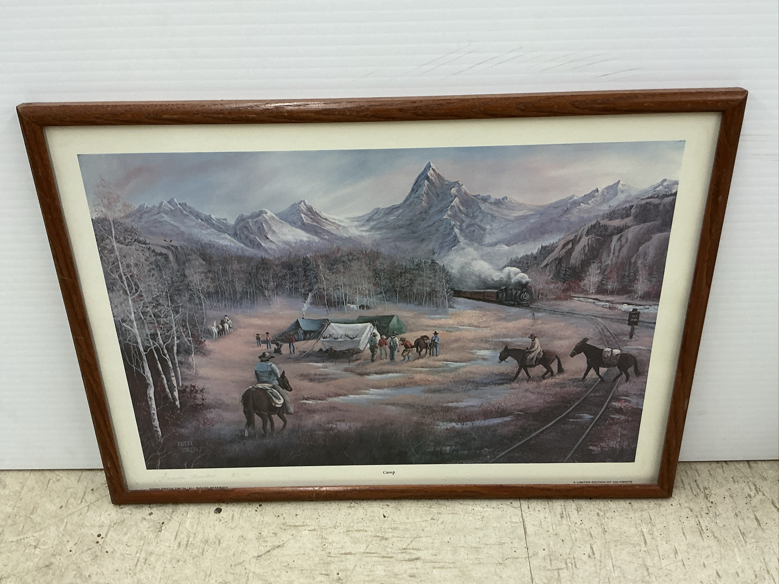 Framed limited editionsigned print by Frieda Timlin, titled 'Camp'. This is print number 31 of a limited run of 100. The print depicts a western scene with a camp, horses, and a steam train in a mountain landscape. 19 x 26 in.