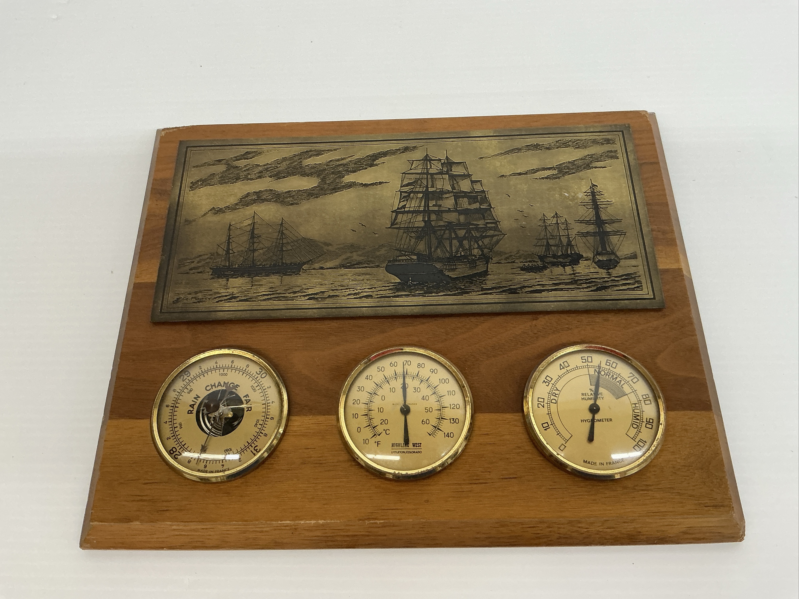 Wooden wall hanging weather station with an embedded plaque depicting a seascape with sailing ships. Features three inset gauges, including a thermometer marked in both Fahrenheit and Celsius, a barometer that forecasts rain, and a hygrometer indicating relative humidity. 10 x 13 in.