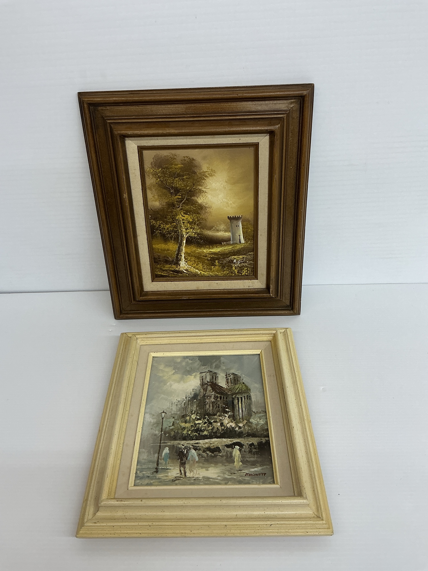 Two framed oil paintings on canvas, one depicting a landscape with a tower signed and the other showing a waterside scene with figures signed 'Barnett'. Largest 17 x 15 in.